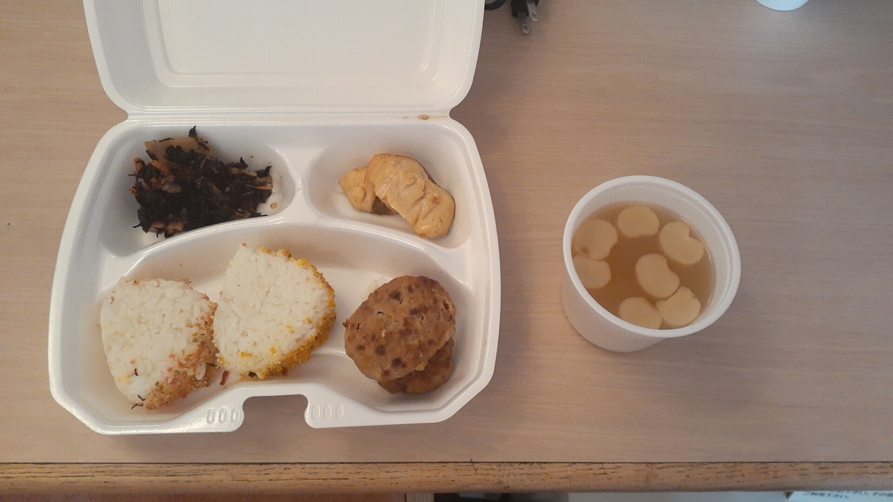 この日の場合、朝食はおにぎり・サラダ・ひじきの和え物・焼魚・ハンバーグ等と品数は十分でした。