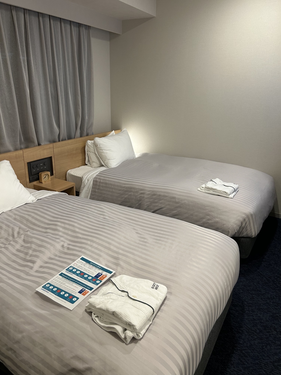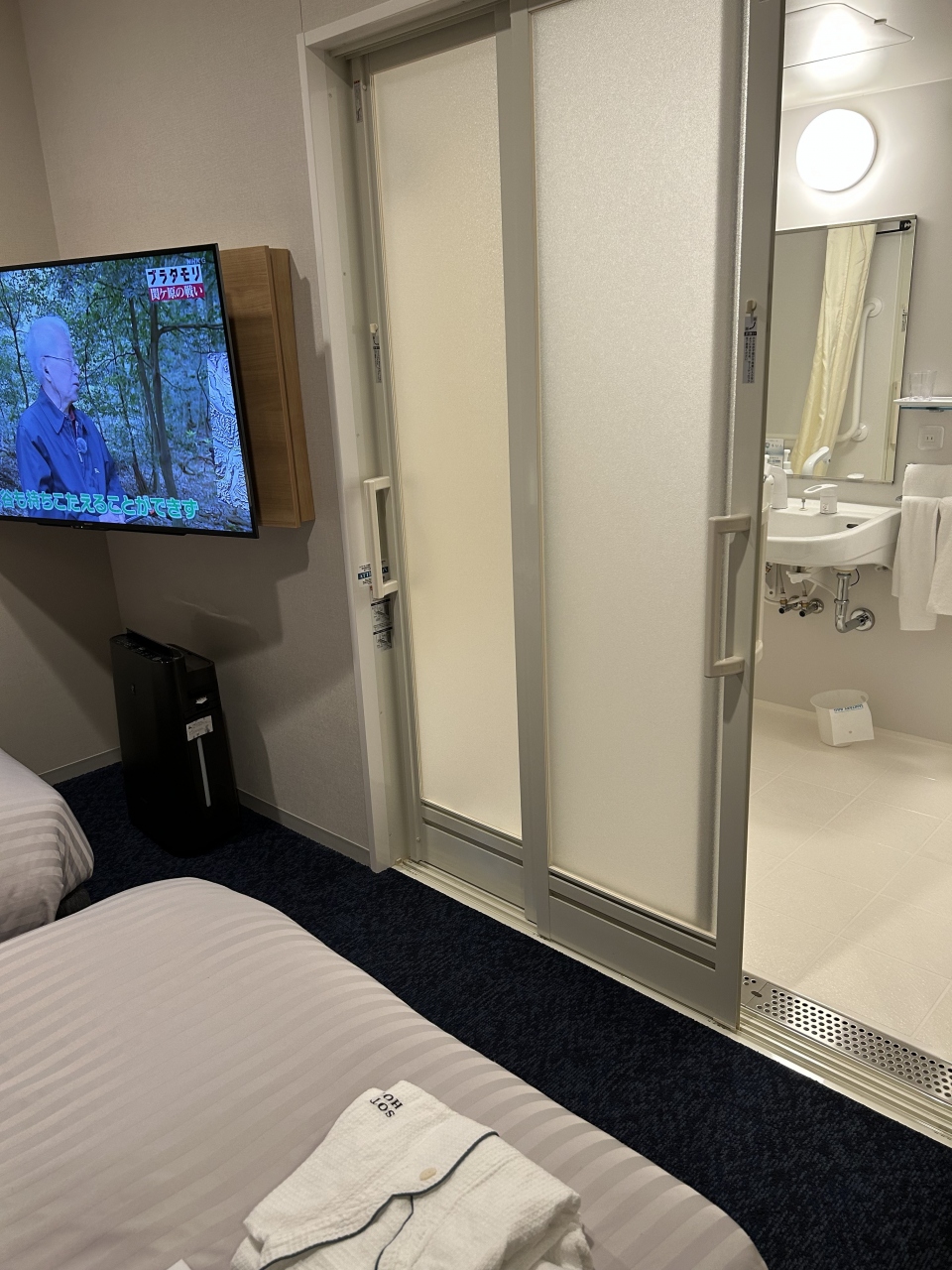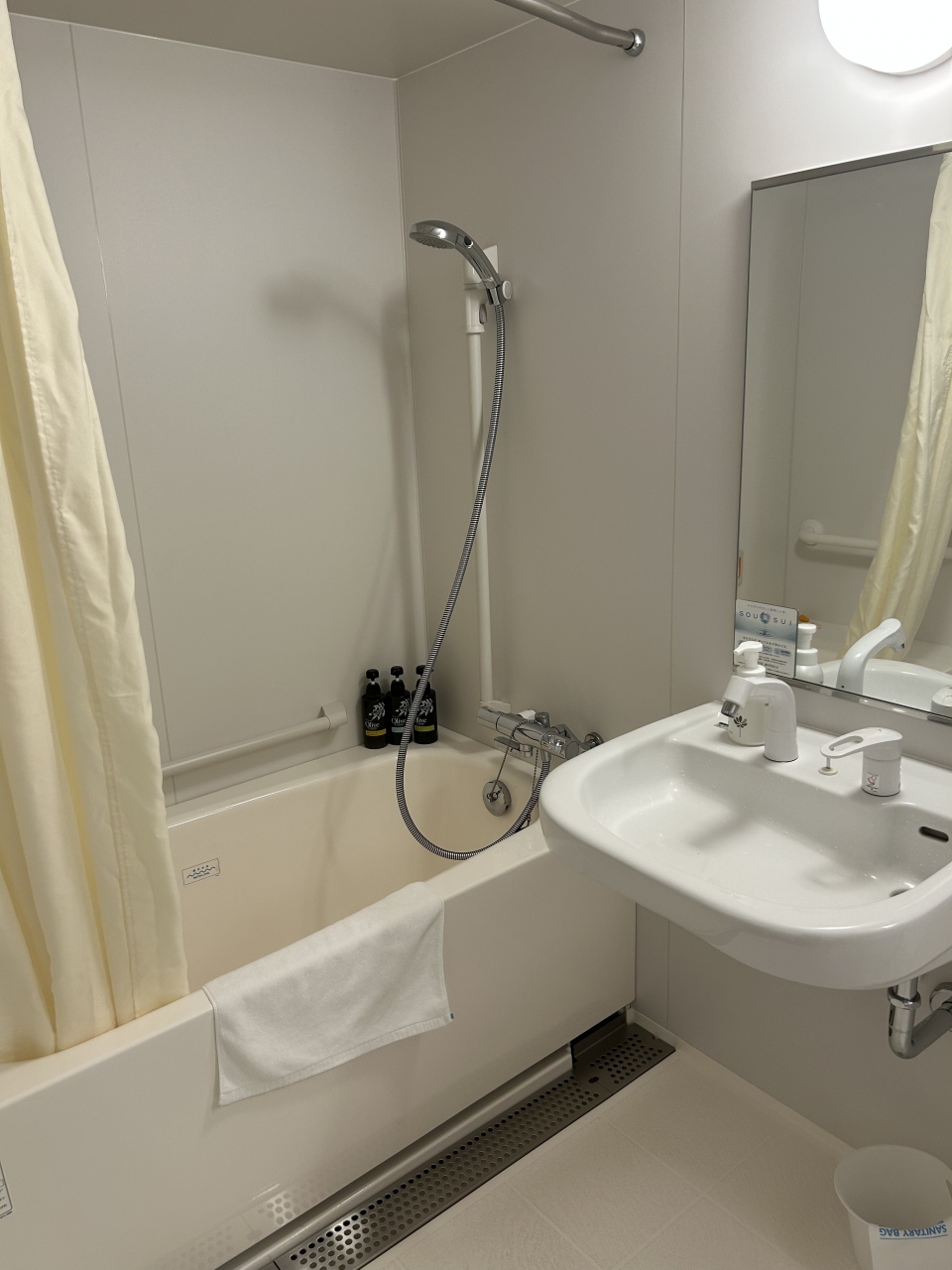直前の予約だったので、いつも利用するホテルズドットコムで空いていたツインがユニバーサルツインだけでした。ハンディキャップをお持ちの方が安心して泊まれる設計のため、広いバスルームでした。部屋自体も広かったです。
