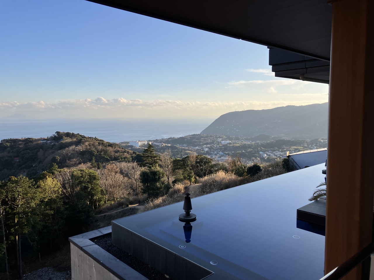 熱川駅から送迎があります。かなり山を登っていくと、山の上に似つかわしくない南国リゾートの雰囲気を醸し出したエントランスがあって、レセプション棟からも部屋からも海を見下ろす造りで、絶景を楽しめます。