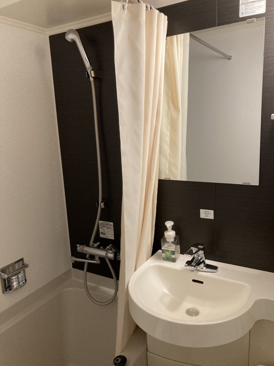 水回りは普通のユニットバス。浴槽が深めなのは嬉しいです。でも、シャワーカーテンの匂いがかなり気になりました。