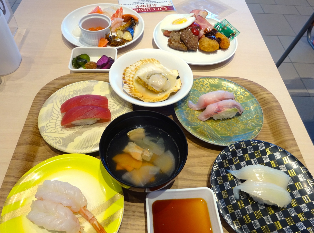 朝食はバイキング形式、ミニ回転すしもあり、新鮮な魚介類も食せる。