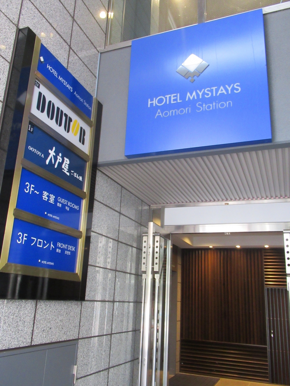 青森駅から歩いて3分、しんまち通りにあるホテルです。フロントは3階にあります。1階にはドトールコーヒーと大戸屋ごはん処があります。浴室は洗い場があって、家(家庭)の風呂のようです。 廊下にウオーターサーバーがあるので、部屋にあるウォーターピッチャーでそこから水をくんできます。