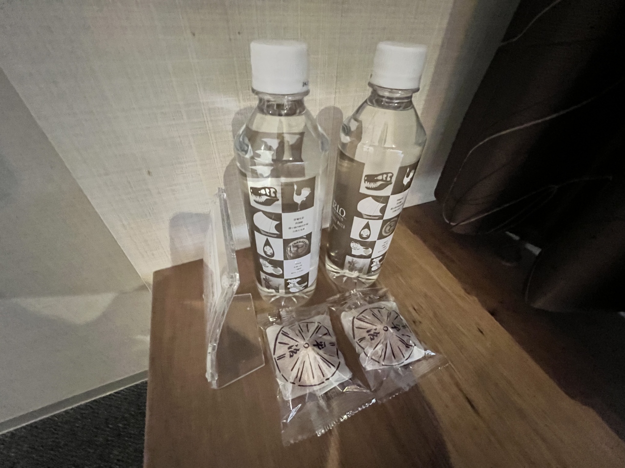 ミネラルウォーターとおせんべいがサービスで、ここのお水はおいしいです。