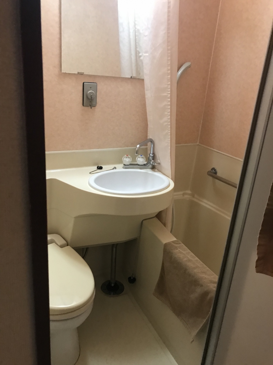 ユニットバスのトイレは普通の人なら狭さを感じないが、バスは幅50cmもないのではないかと思う程の狭さ。