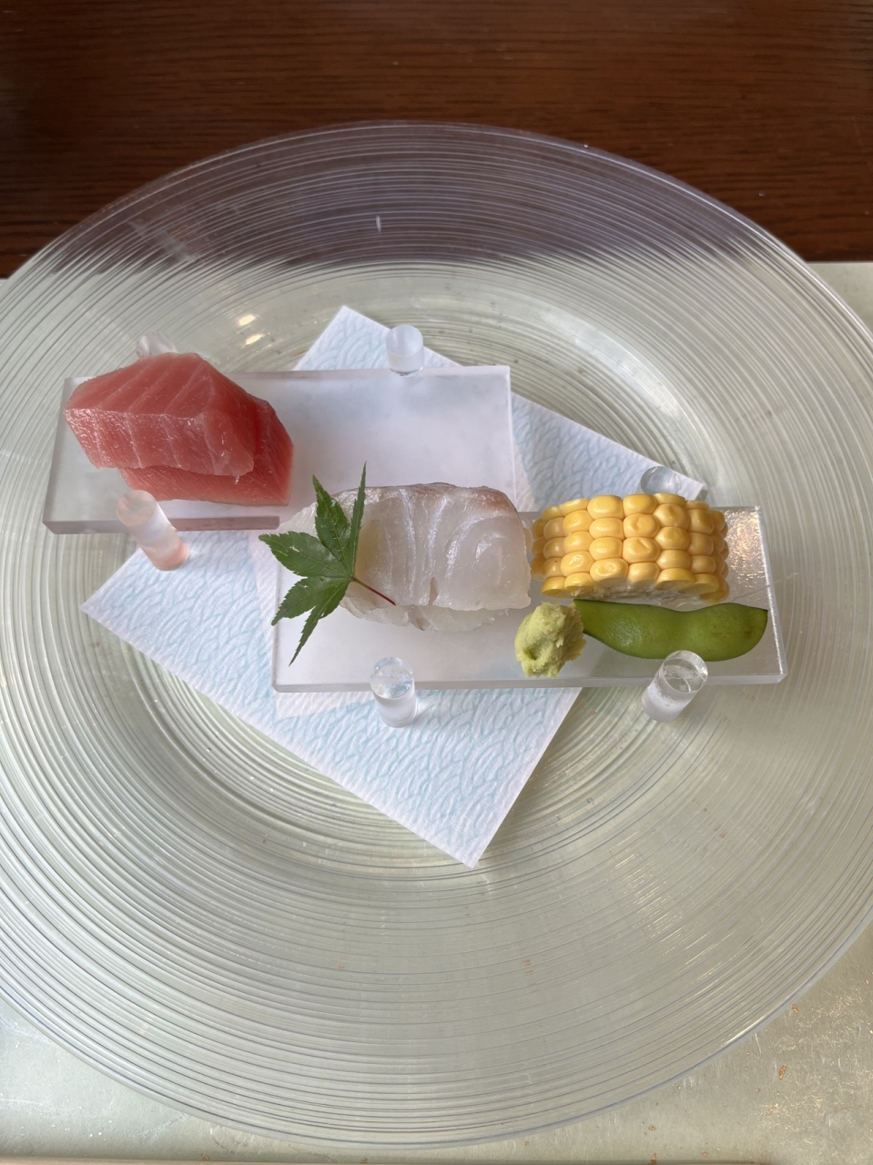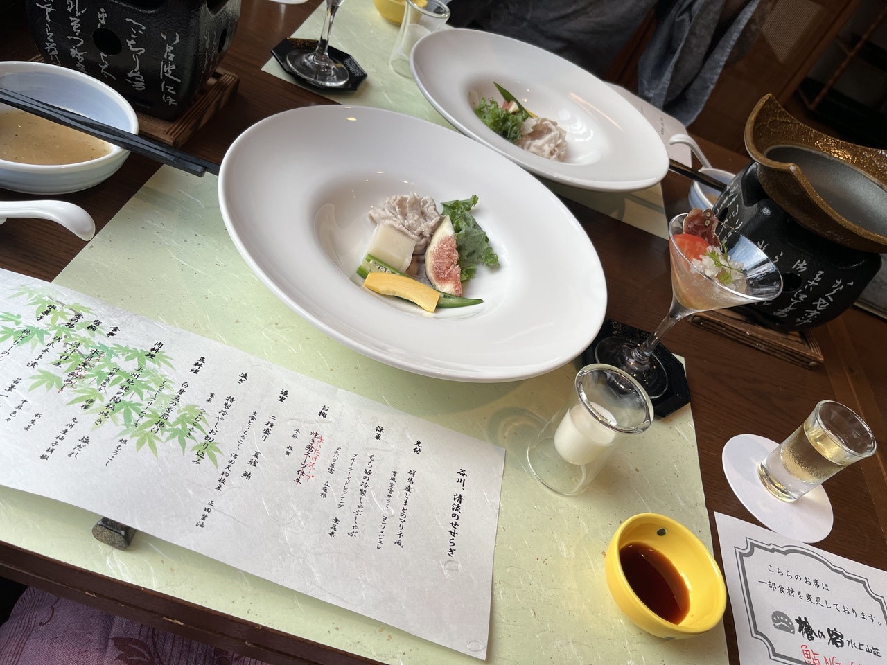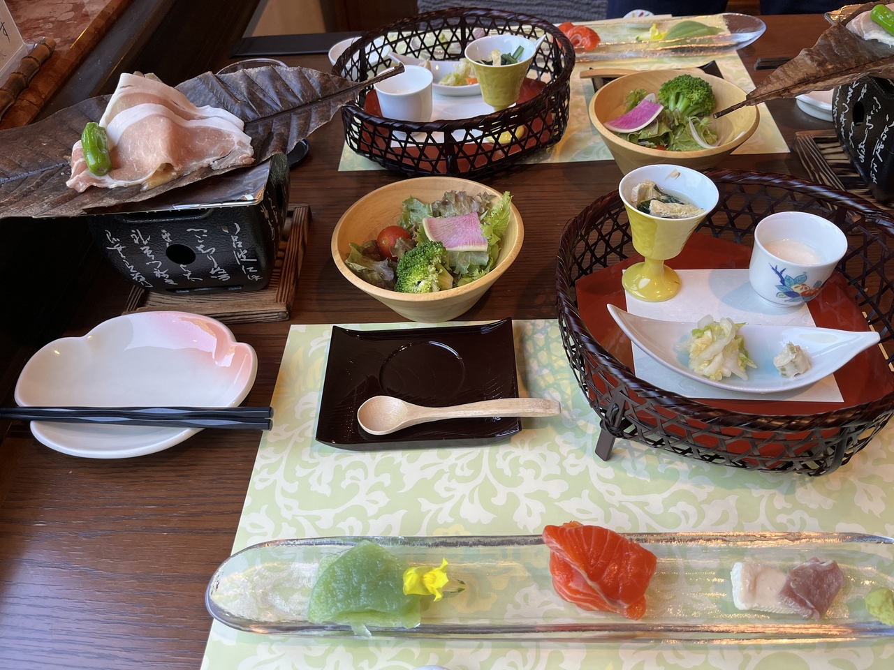 こちらのお風呂は、天然温泉で飲泉できるとのことでした。少しぬるめかなと感じましたが、季節的には問題なかったです。夕食朝食ともに、美しい器に盛られた美味しい食事でした。