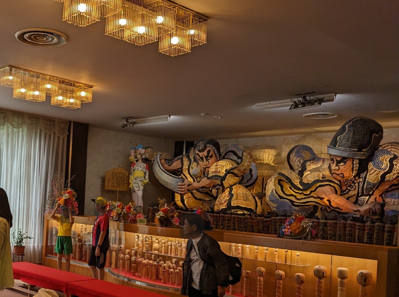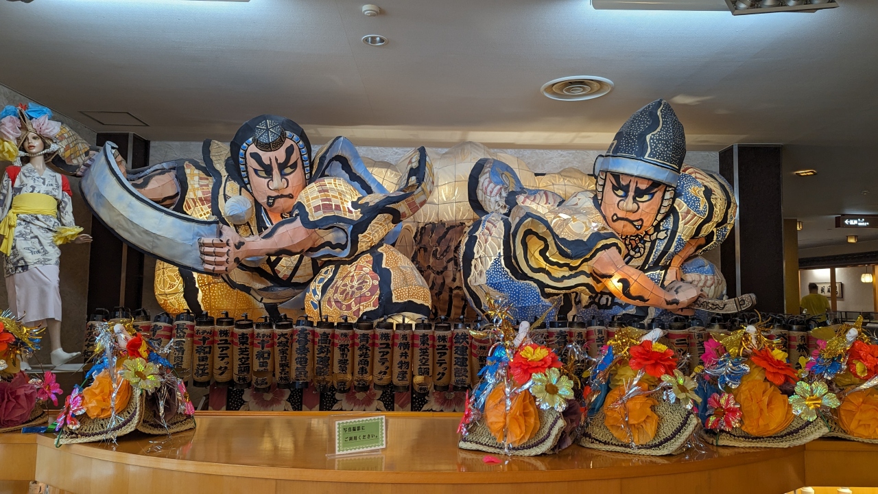 ロビー奥にはねぶたが陳列してあります。花笠も置いてあり花笠をかぶって記念写真も撮れます。