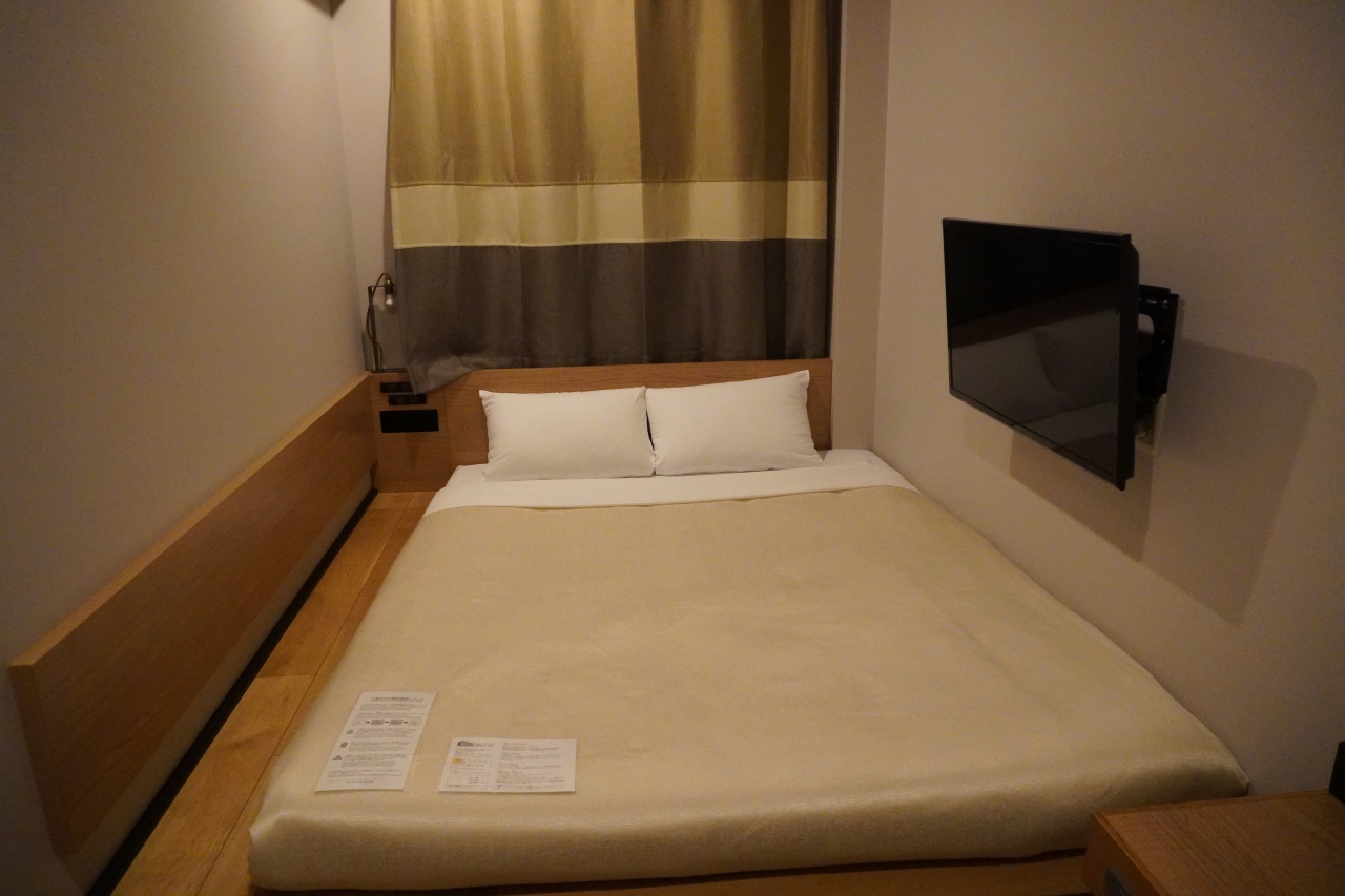 SAKURA TERRACE THE ATELIERは、京都駅の南エリア。地図だともう少し近そうだったのですが、ちょっと歩きますね。外観はマンションみたいな建物。部屋は小さめですが、逆に、そのスペースいっぱいにベッドを置いていて、ベッドの上で過ごしているとそこまで狭さを感じさせないという仕掛けですね。荷物が少ない人には悪くない工夫だと思います。