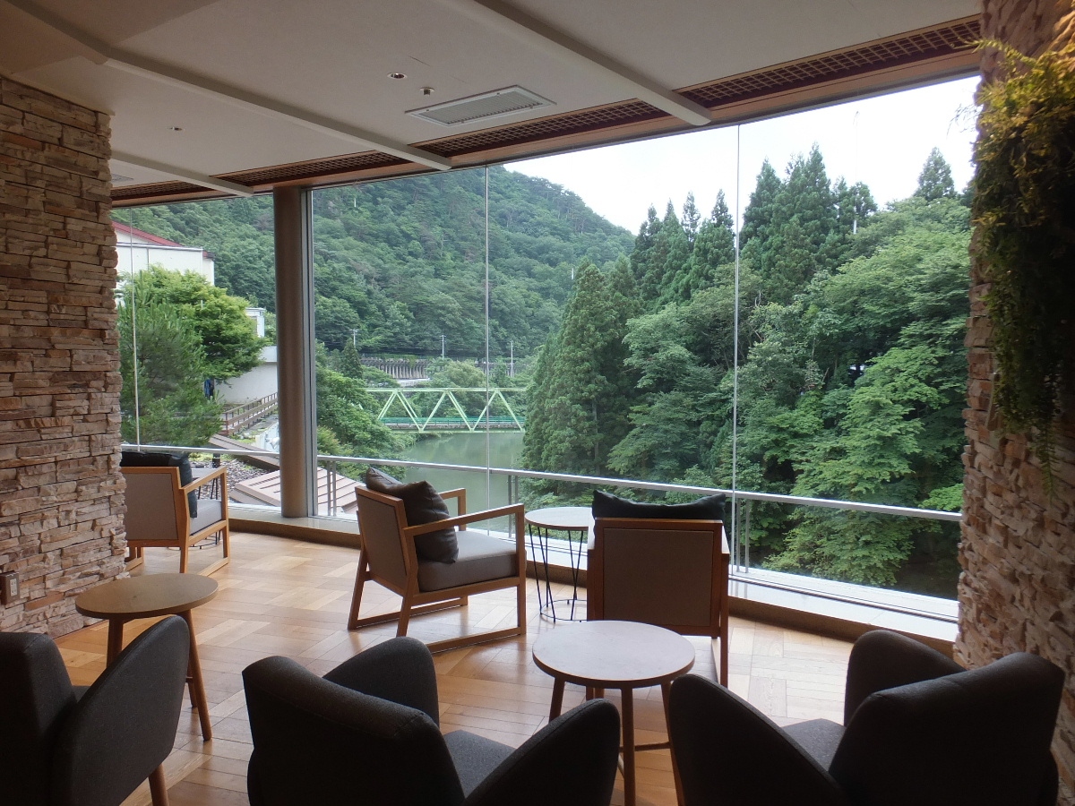 眼下の川と目の前の林が視界に飛び込んでくる渓流ラウンジ。