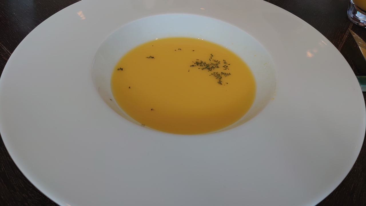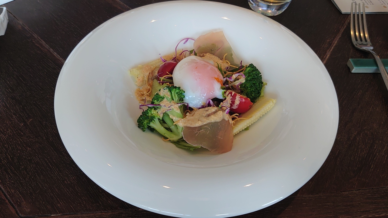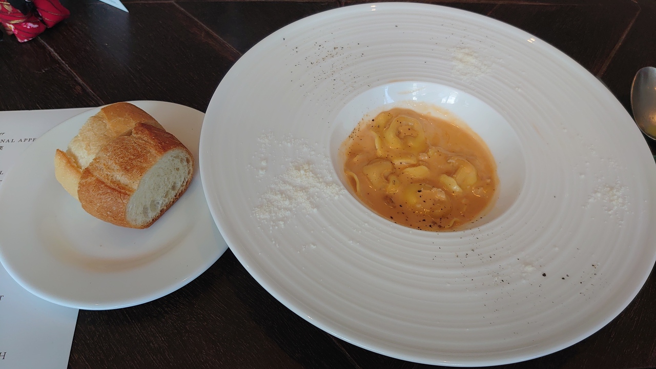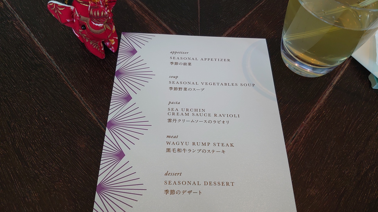 前菜のサラダ、冷製スープ、雲丹ソースのラビオリ、和牛ステーキ、デザートとどれも美味しかったです。