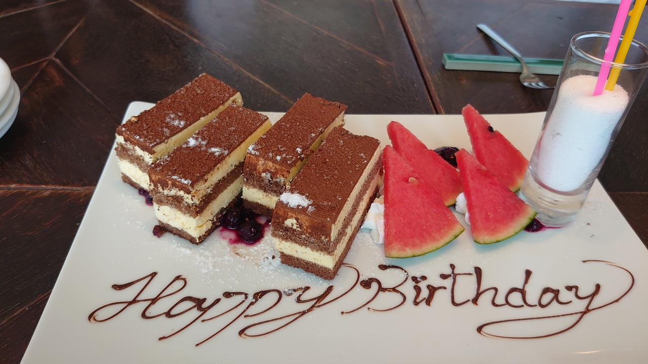 料理は5品でドリンクバー付き。バースデーのデザートプレートに加えて、額縁付き写真もプレゼントされて嬉しかったです。これで1人4500円はかなりお得だと思います。