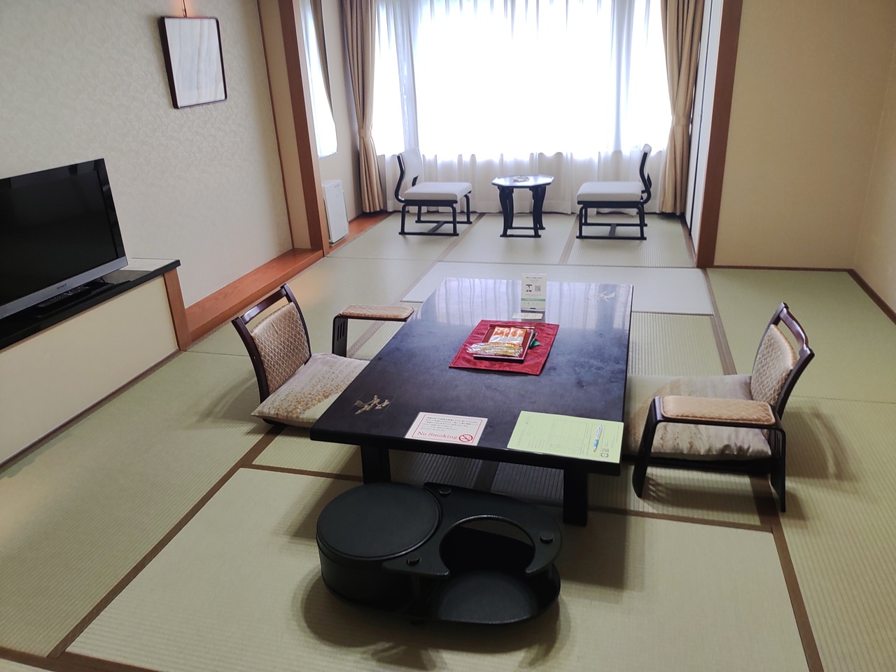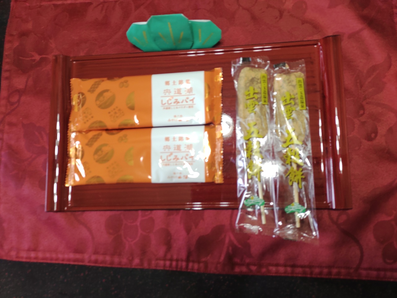 昔は、どの温泉にも、お部屋にお茶うけが置いてありましたが、最近は省略されていて寂しい思いをしていましたが、このホテルはちゃんとあって、とても嬉しかったです。つぶ餡の出雲五平餅と、しんじ湖パイが一つずつでした。美味しかったですし、旅の疲れが取れました。お部屋も快適でした。