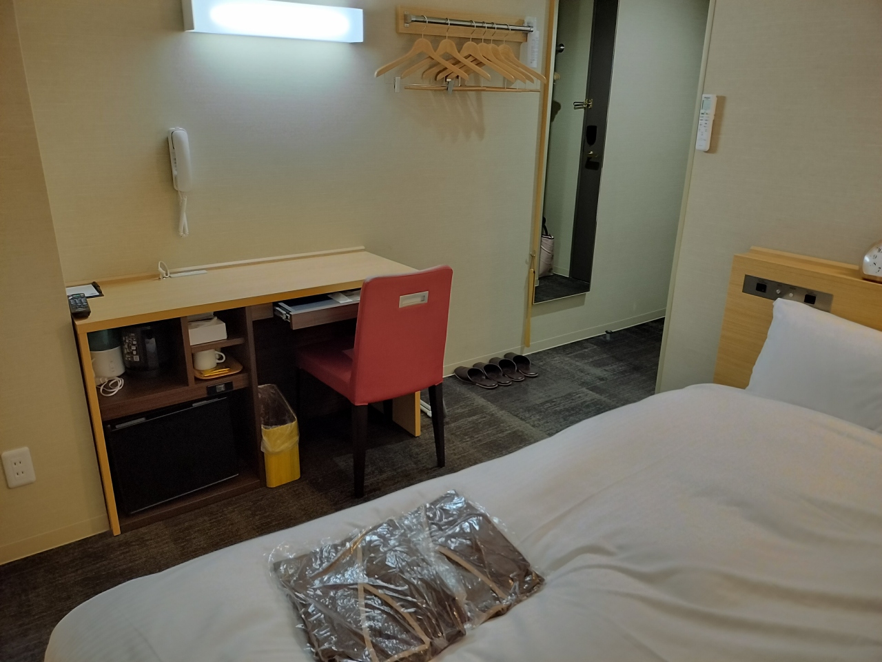 エレベーターは1基、部屋着は作務衣、冷蔵庫には冷凍室がなく、客室の飲み物は粉のお茶で、女性用アメニティはありません。