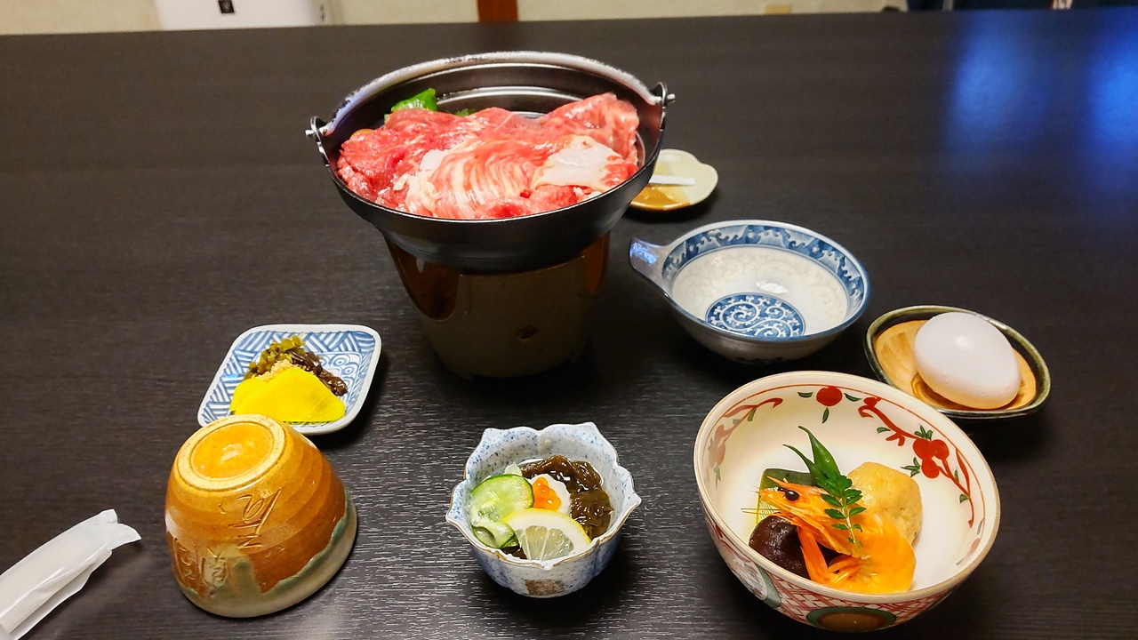 食事は松阪牛のステーキ、すき焼き、しゃぶしゃぶ、牛鍋、かも鍋などのプランがあります。