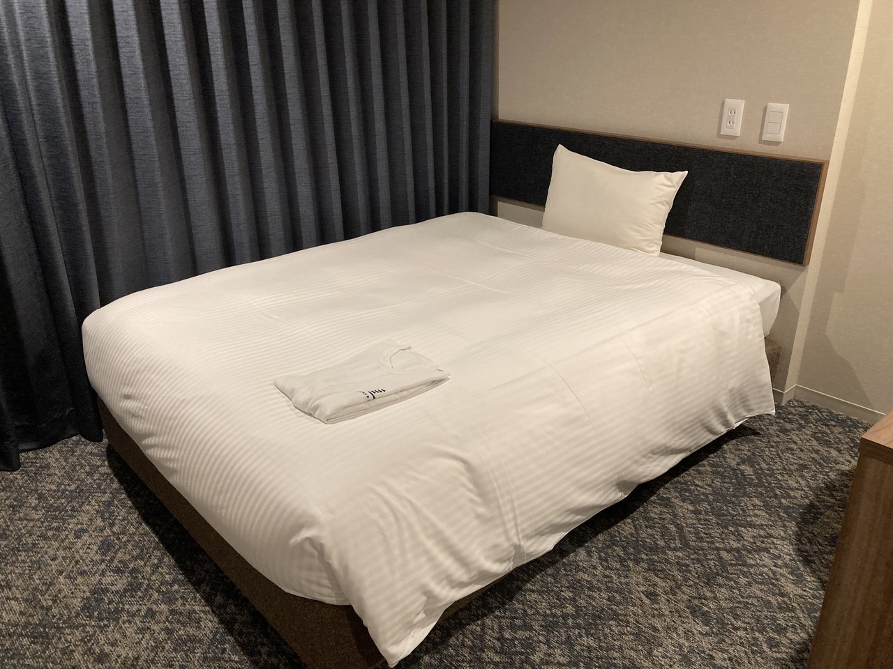 客室は、ユニットバスとベッド、机、小型冷蔵庫と、一般的なビジネスホテルのつくりでしたが、ちょっと広さにゆとりがありました。