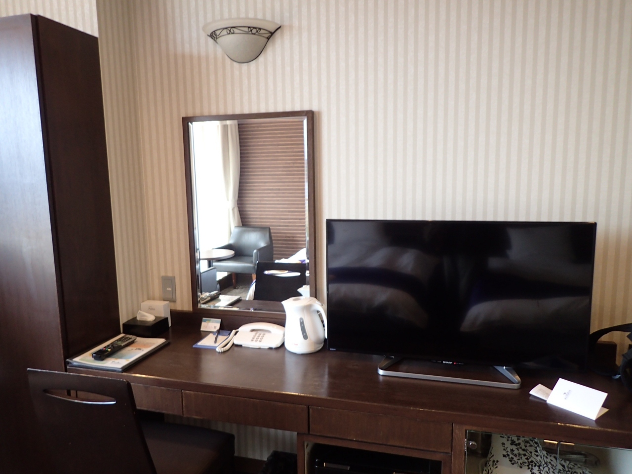 無料WiFi、冷蔵庫、ポット、金庫、ドライヤー、スリッパなど、設備・アメニティーに不足はない。