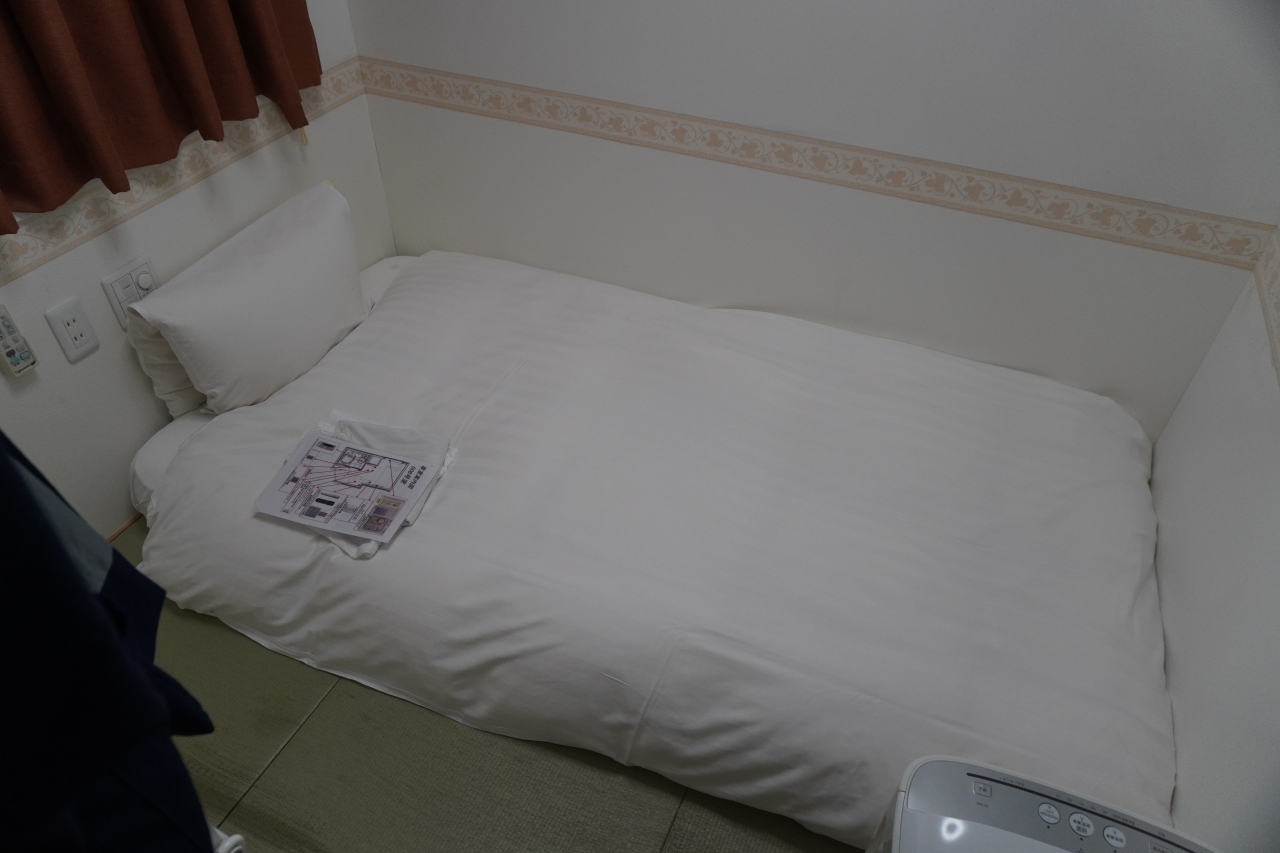 チェックイン四条烏丸は、京都の中心部なのにけっこう安い。やっぱり、ちょっと狭いからですよね。畳の部屋にきっちりハマる引くベッドを置いて、そのベッド周りのスペースはほとんどない状態。荷物が多い人だとこれは困るかもしれません。思い切った省スペースだと思います。