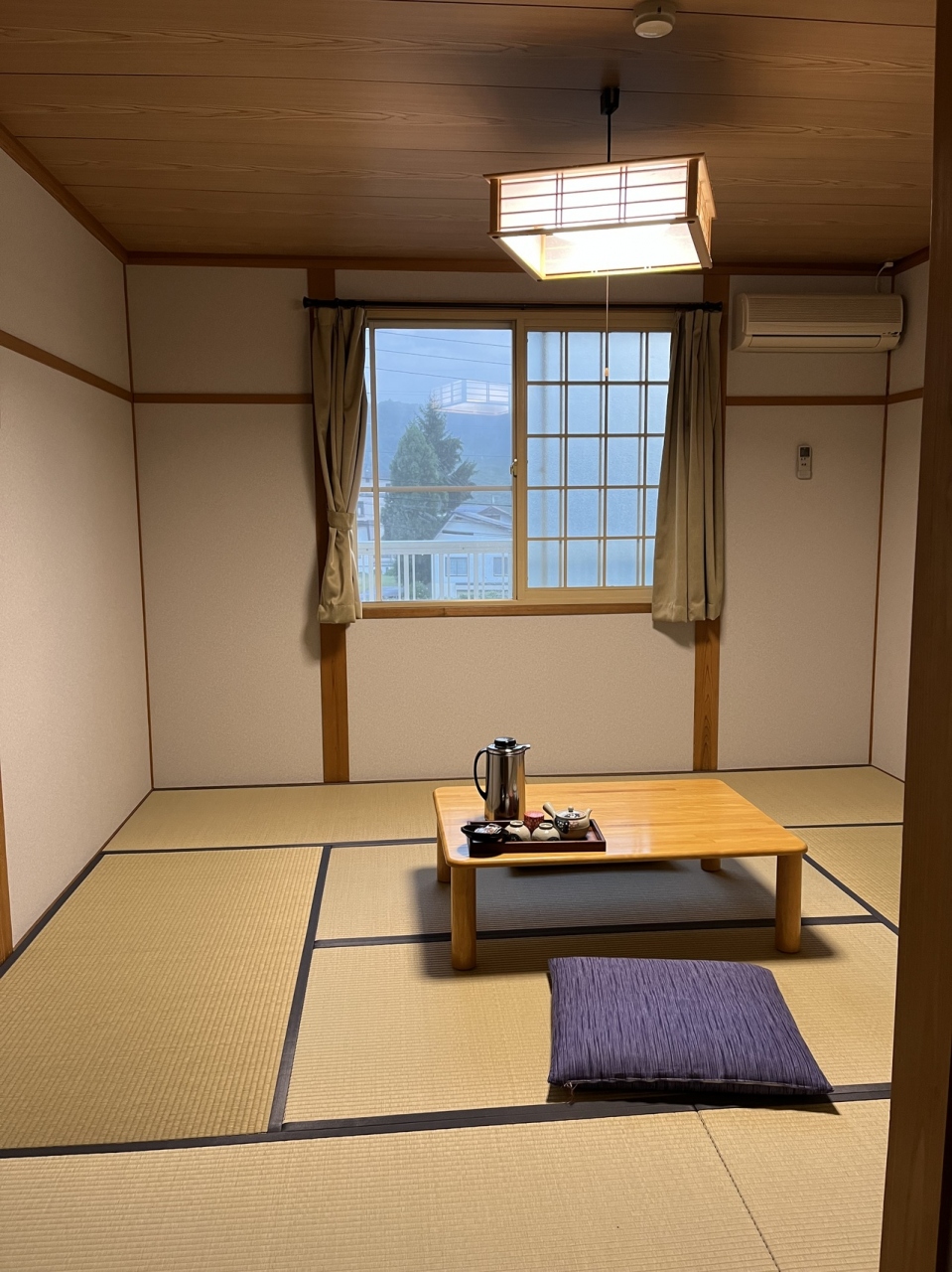 可愛いらしい建物に温かみのある談話室、部屋は2階で階段のみです。洋館風ですが部屋は和式のザ・スキー宿、水回りはユニットバスです。お布団は自分たちで準備します。この辺りでは一般的なので安心があるとも言えます。