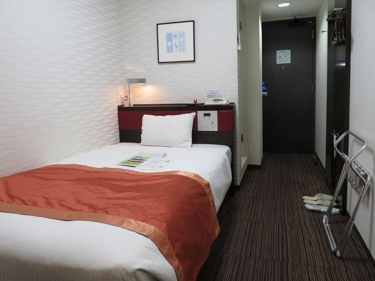 宿泊した部屋のタイプはシングルで、幅が狭く奥行きの深い客室でした。窓側にライティングデスクのあるレイアウトです。壁は白で、デスクやヘッドボードは黒や濃い色の内装です。明るく感じられる部屋でした。
