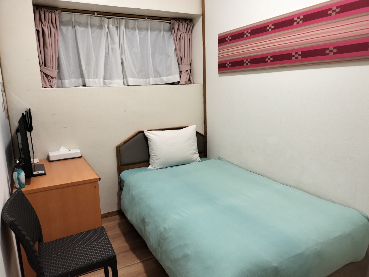 シングルルームは狭く、エアコン・テレビ・冷蔵庫・物干しロープ・wi-fiがあり、タオルや部屋着はありません。