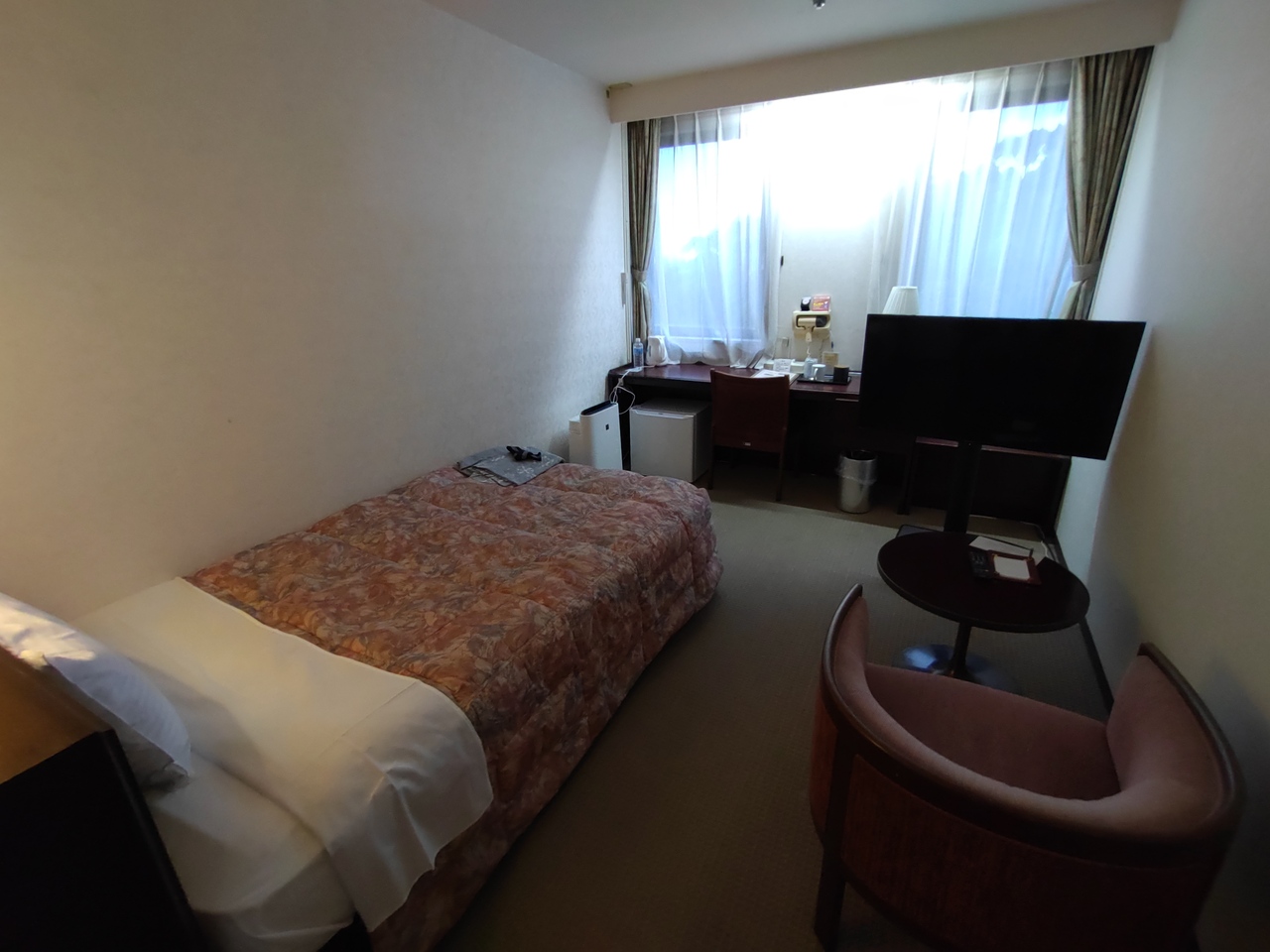 シングルの部屋は広めですが、あとから設置した大型テレビの置き場所に困ったらしく、部屋の中ほどに自立式で置いてありました。