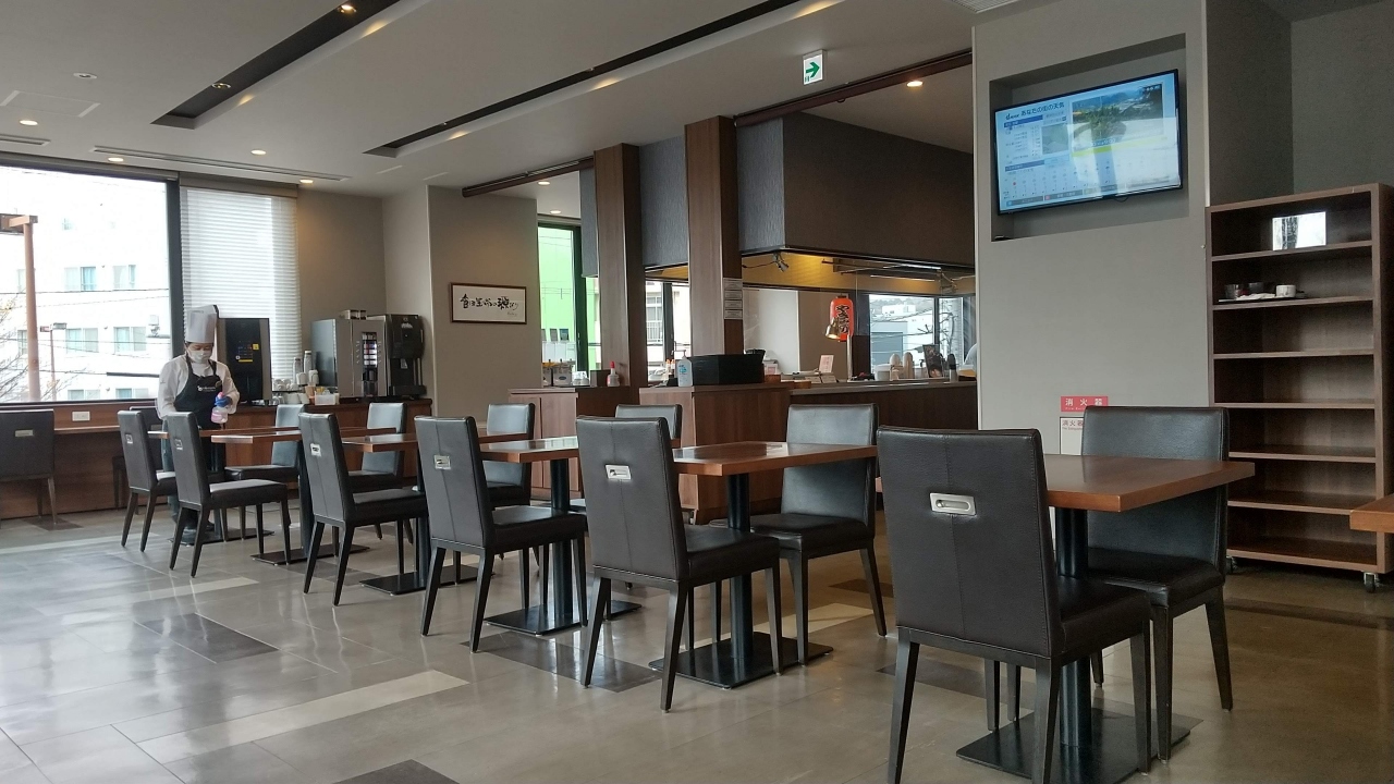朝食は明るくて気持ちの良い空間で。ご当地メニューのカレーラーメンは珍しく、美味しくいただきました。小鉢等品数が多く、焼きたてを持ってきてくださるオムレツもあり、すっかりお腹いっぱいになりました。