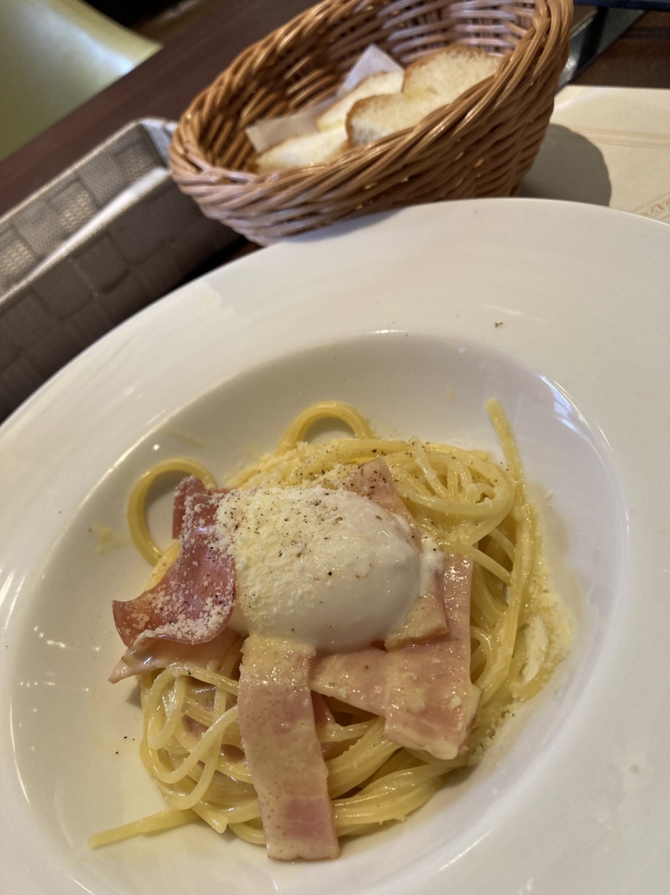 シーフードマリネサラダ、カルボナーラ、ポークステーキ、チーズケーキ、コーヒーの定番ですが、シーフードの種類、ステーキの付け合わせに変化がありました。