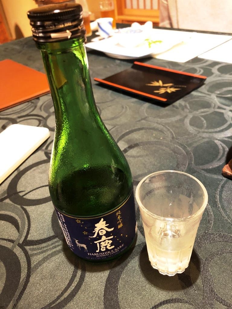着いたのが午後4時30分頃で食事の時間が午後7時で時間があるので、お土産探しと付近を散策することにしました。家内が、雑誌で元林院町の鹿猿狐ビルにある「中川政七商店奈良本店」に可愛らしいお土産があるということで行ってみることにしました。その帰りに同じビルにある「猿田彦珈琲奈良鹿猿狐ビルディング店」でお茶をしました。食事の時間ギリギリに宿に戻りました。夕食は、趣ある「寧楽」で用意され、「秋の会席料理」でした。まず、「秋の会席料理」についている食前酒と前菜の七種盛りが出てきました。ほうれん草とエノキのごま和え、柚子風味柿松葉、絞り紫芋きんとん、鮒甘露煮、イチョウ南瓜、サーモン黄味寿司、むかご真丈の盛り合わせで味もさることながら、彩が非常にきれいで食をそそりました。さらに食欲を増すために、奈良の老舗「今西清兵衛商店」の名酒「春鹿」を注文しました。口当たりも香りもいいお酒でした。前菜の次は、鮪、鯛昆布じめ、紋甲イカの盛り合わせのお造りです。新鮮で、魚の臭みもなく、刺身嫌いの私もすんなり食べることができました。お造り次は椀物で「かぼちゃのすり流し」というものが出てきました。裏ごししたかぼちゃが茶碗蒸しのような食感で、プリンのような甘みもありました。椀物の次は蒸物で「蓮根まんじゅうそばの実あんかけ」です。あんこは入っていませんでしたが、出汁が蓮根の旨みを引き出していました。蒸物の次は焼物です。焼物は「秋刀魚の柚香杉板焼」です。焼いた秋刀魚を杉の皮で包みこんだもので、値段が高かったのでたべることができず、今年初めての秋刀魚でした。焼物の次は、揚物の「海老のカダイフ揚げ」です。ちなみに、「カダイフ」は小麦粉で作られた「天使の髪」と呼ばれるとても細い麺です。中東や地中海地域ではデザートとして使われます。これを揚げ物の衣に使うと、サクサクとした食感が楽しめるということです。確かに、サクサクとしていて海老との相性も抜群でした。次は、酢物で「合鴨と林檎のサラダ」でした。合鴨に林檎を添えるとどのような味になるのかとおそるおそる食べましたが、意外や意外、林檎の甘みと酸味で合鴨の肉本来の旨みを引き出していました。次の御飯は「きのこの釜めし」で、固形燃料を使い目の前で調理します。時間が経つにつれ、蓋がゴトゴト音をたて、蒸気を吹き出していました。固形燃料が消えると出来上がりです。アツアツホクホクの釜めしです。海老芋もみじ、三ツ葉の入ったお吸い物と香物で出された奈良漬金山寺味噌と一緒に食べるとまだ一段と美味しく食べられました。最後が「栗のプリンといちじくのコンポート」でした。新鮮な食材を使ってあったので、非常に美味しく頂くこともできましたし、味もあさることながら、何でこんなに沢山出てくるのと言うくらい量もあり申し分ありませんでした。まさに「余は満腹じゃ」の心境です。