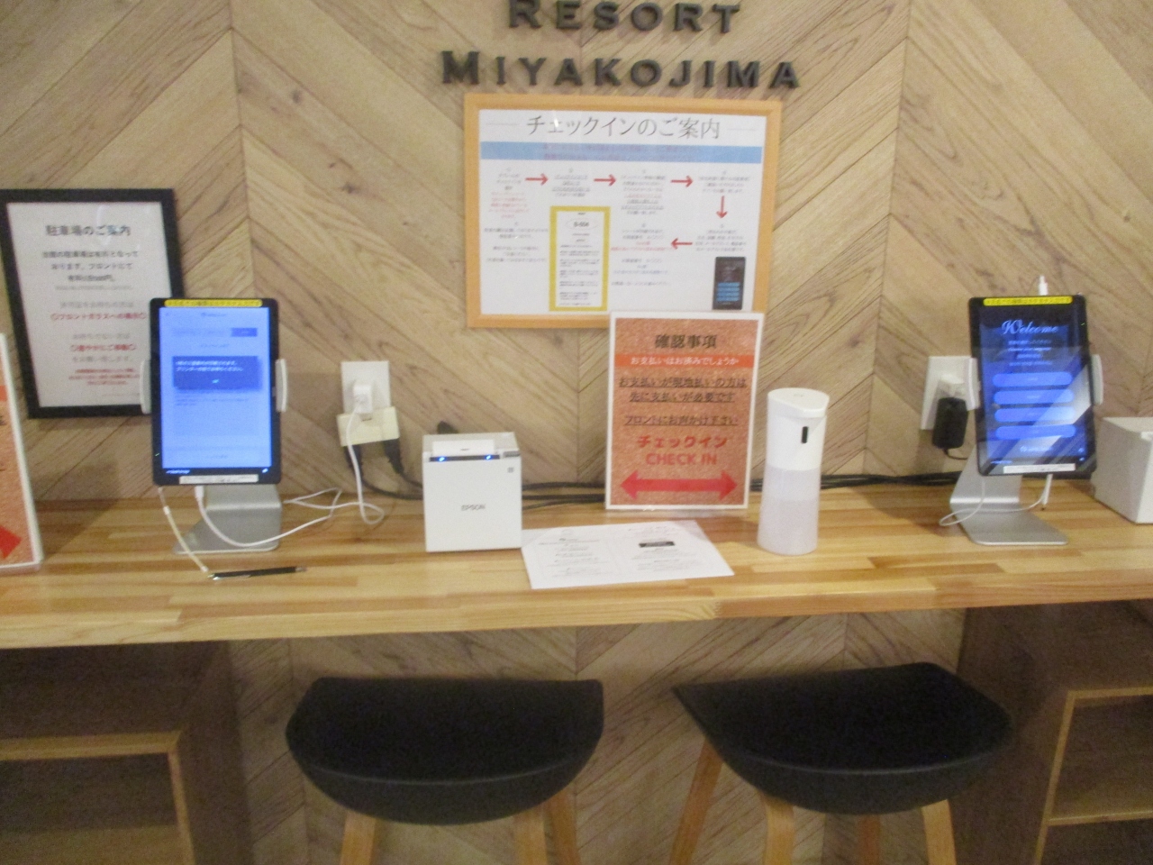 セントラルリゾート宮古島のエントランスを入ると、写真のようにタブレット端末が数台置かれており、それにチェックインするための情報を入力してチェックイン完了となりました。有人ではなく、無人でチェックインができるのは、活気的だと思いました。チェックインが完了すると、ルームナンバーとキーナンバーがレシートに印字されるのでそれを見ながら部屋へと向かいました。