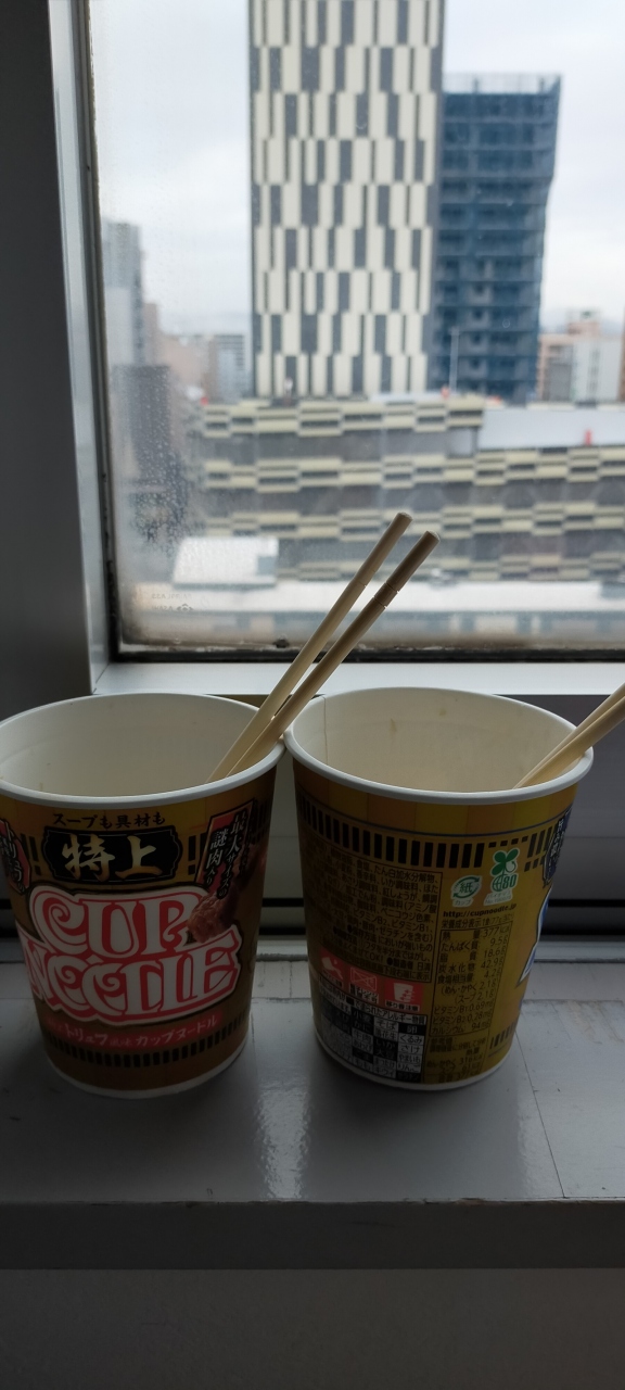 前の人が食べたカップラーメンのカップが2個残っていた。