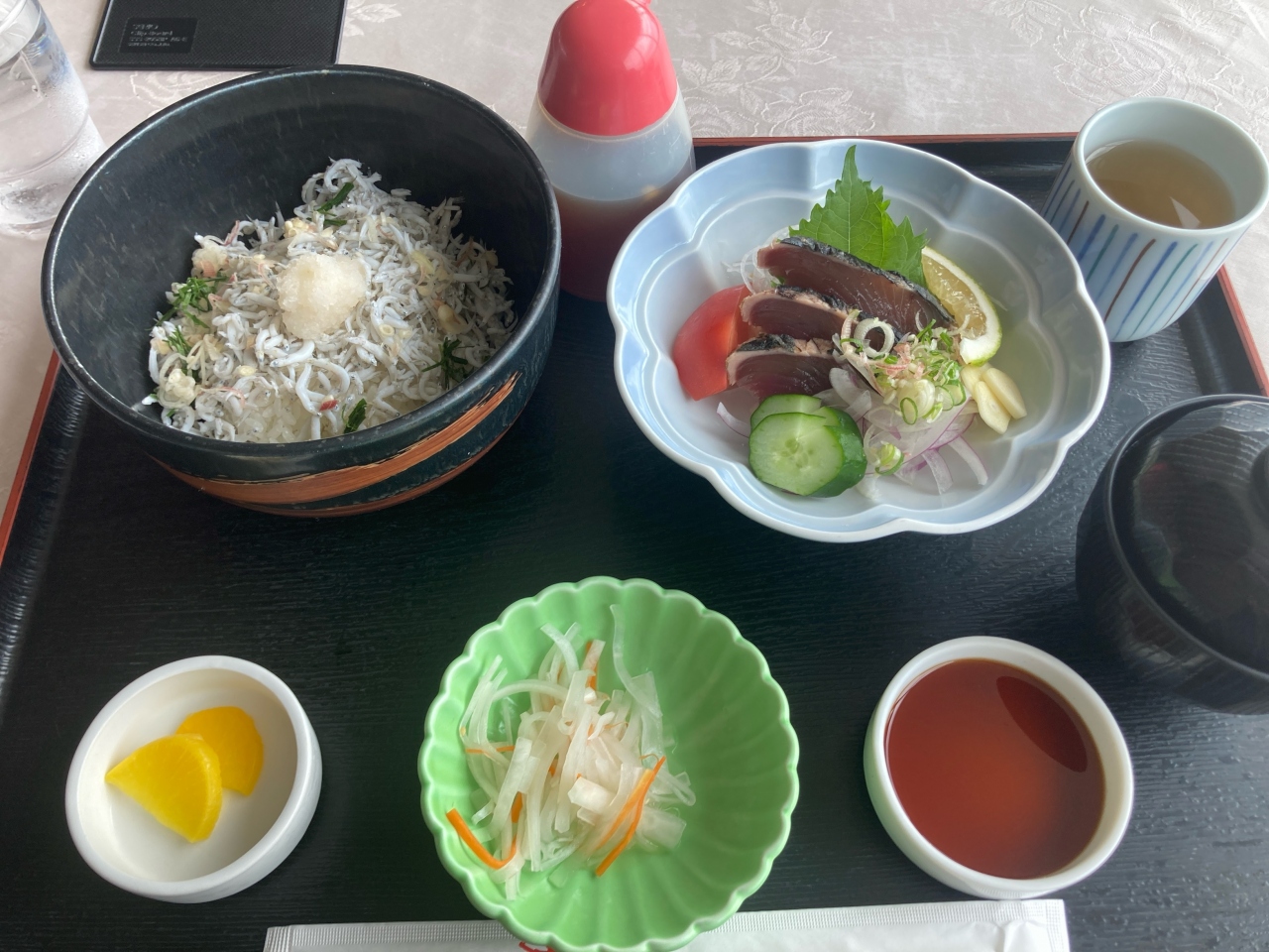 注文したのはランチメニューの釜あげちりめん丼とカツオのたたきのセットで釜あげちりめん丼が町興しのB級グルメ(?)のようだ。