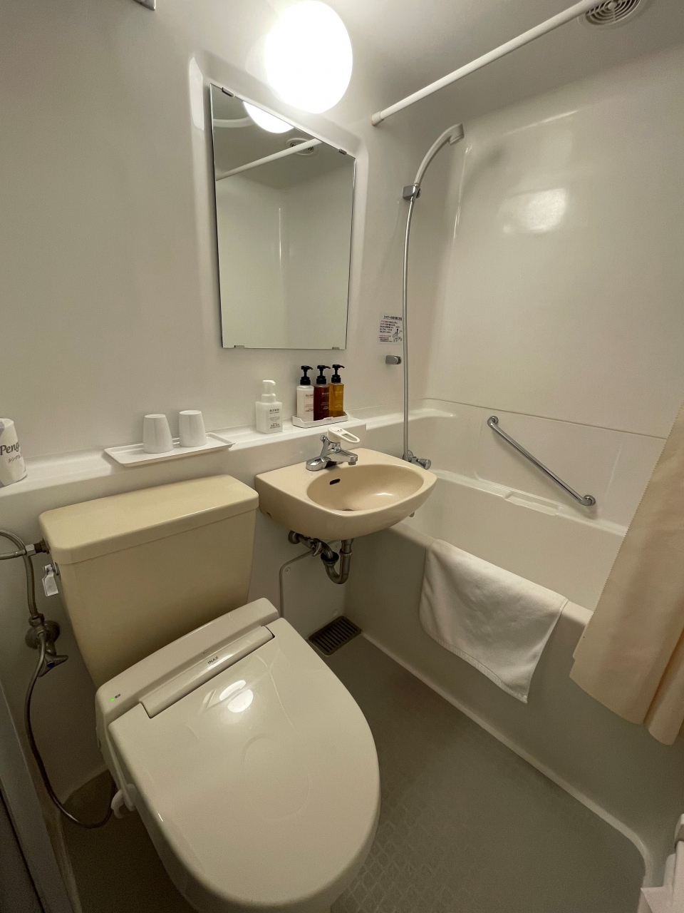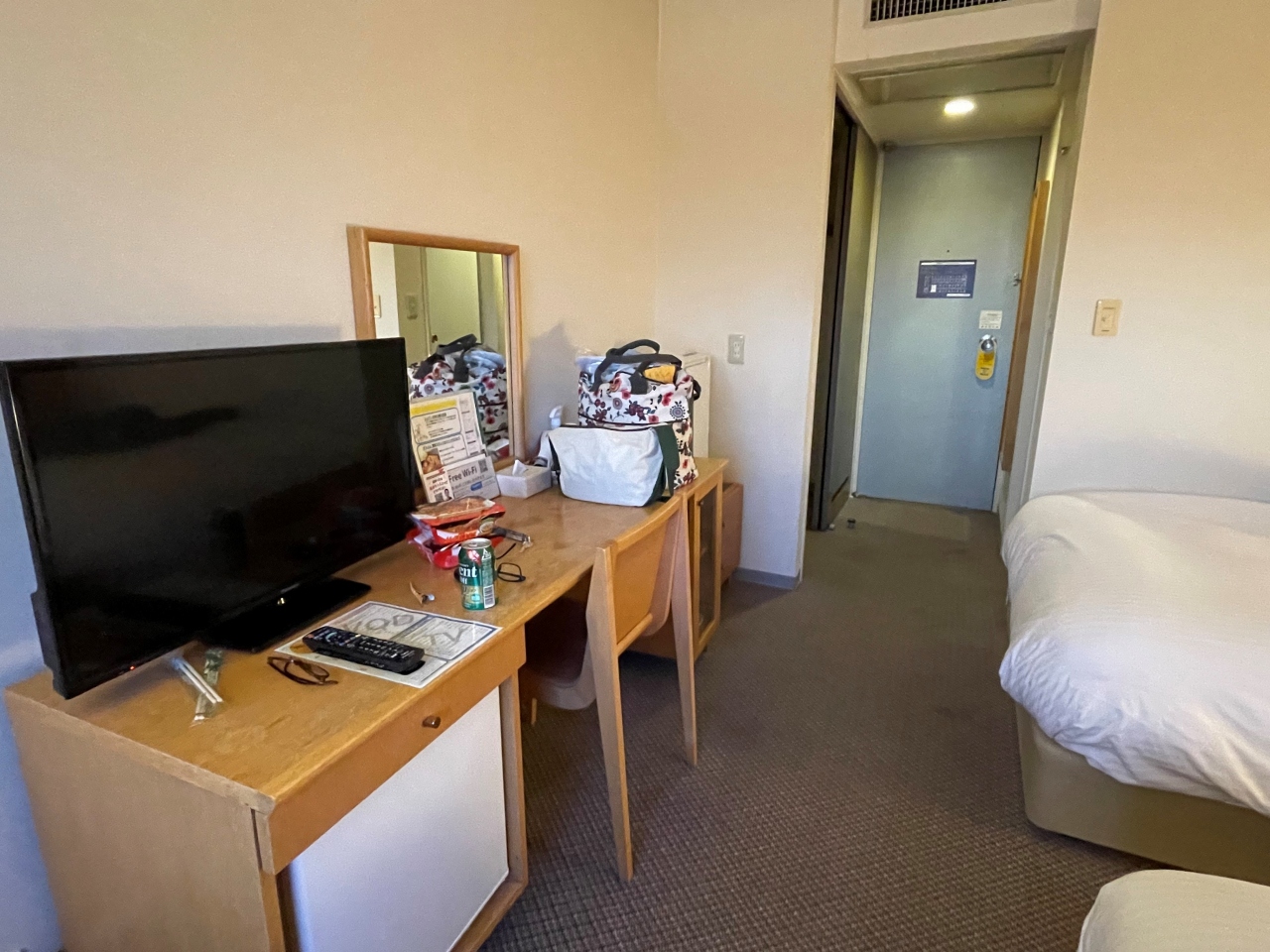 宿泊したツインルームはビジネスホテルとしては広く、クローゼット以外の収納があり荷物を広げるのに重宝しました。部屋には昔ながらの湯呑ちゃわんがあるのですが、持ち手の付いたコーヒーカップかマグがあると嬉しいです(湯呑ちゃわんは熱くて持てないです)。