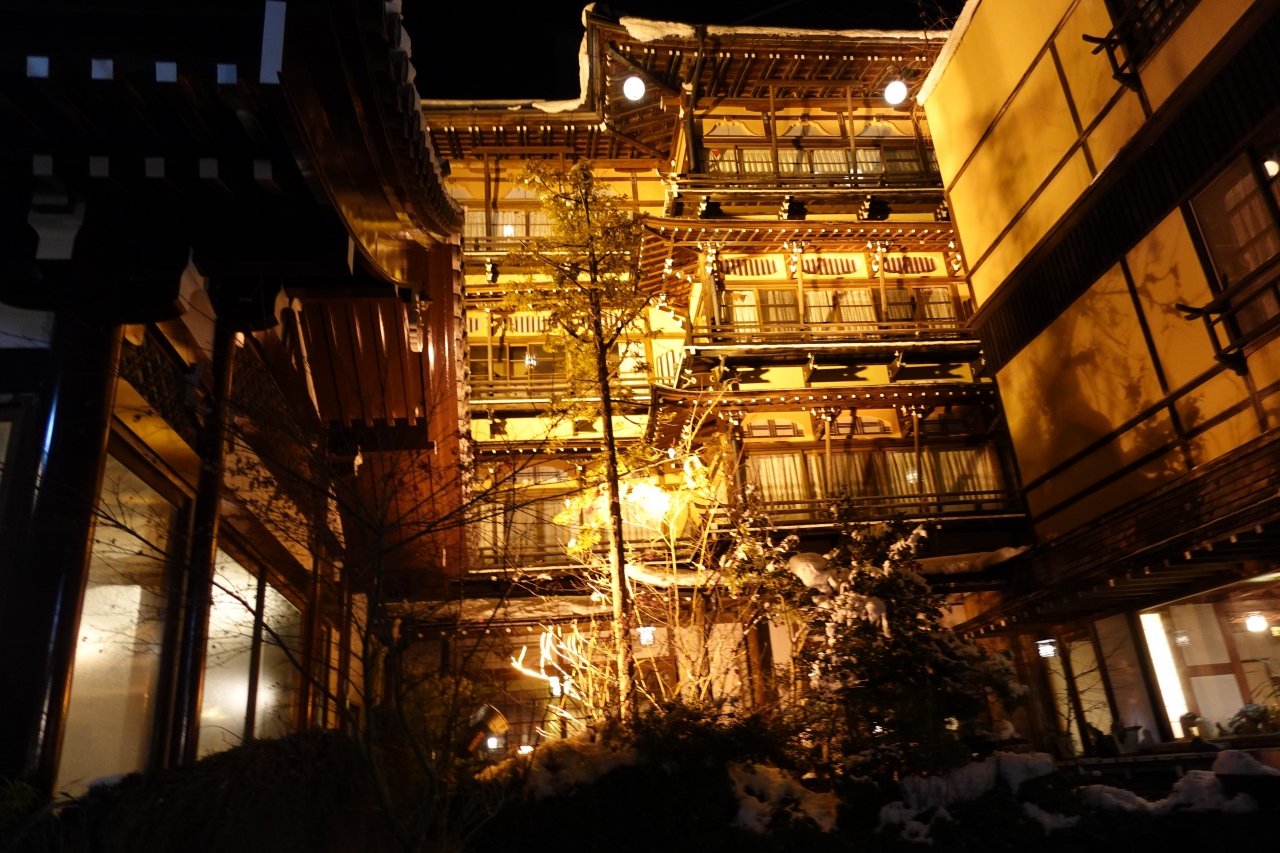 創業260年の老舗温泉旅館。夜はライトアップされて綺麗です