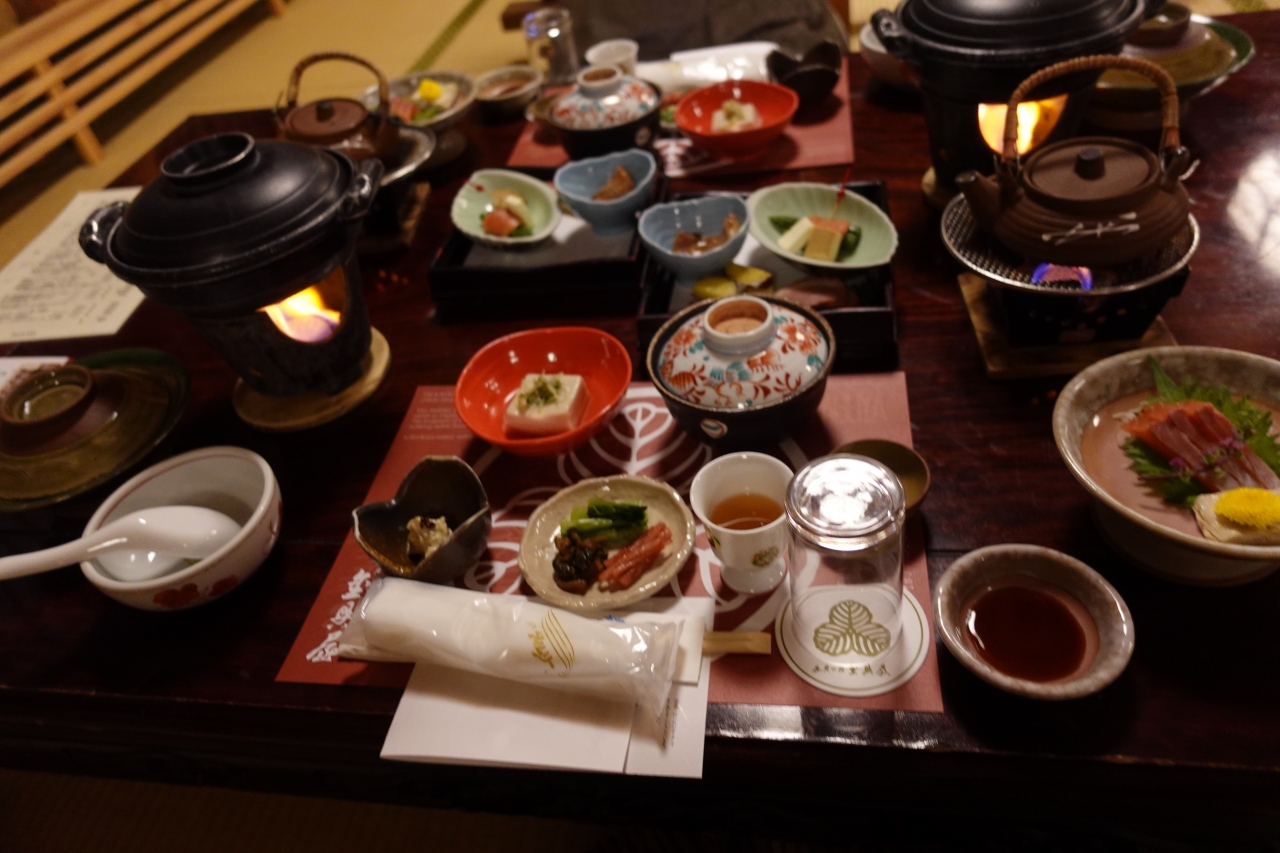 - 食事は、登録有形文化財に認定されている「金具屋大広間」で頂きます。食事は量も種類も多くてお腹いっぱいに!
