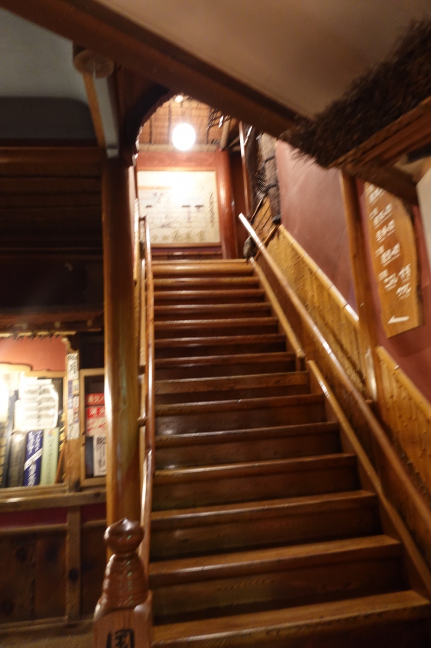 食事は、登録有形文化財に認定されている「金具屋大広間」で頂きます。大広間は座敷130畳、舞台30畳、廊下、床の間を入れると200畳を超える広さで、この広い座敷を柱無しで支えているのは、格子の内側に井桁を組み入れる「折り上げ格天井」だそう。