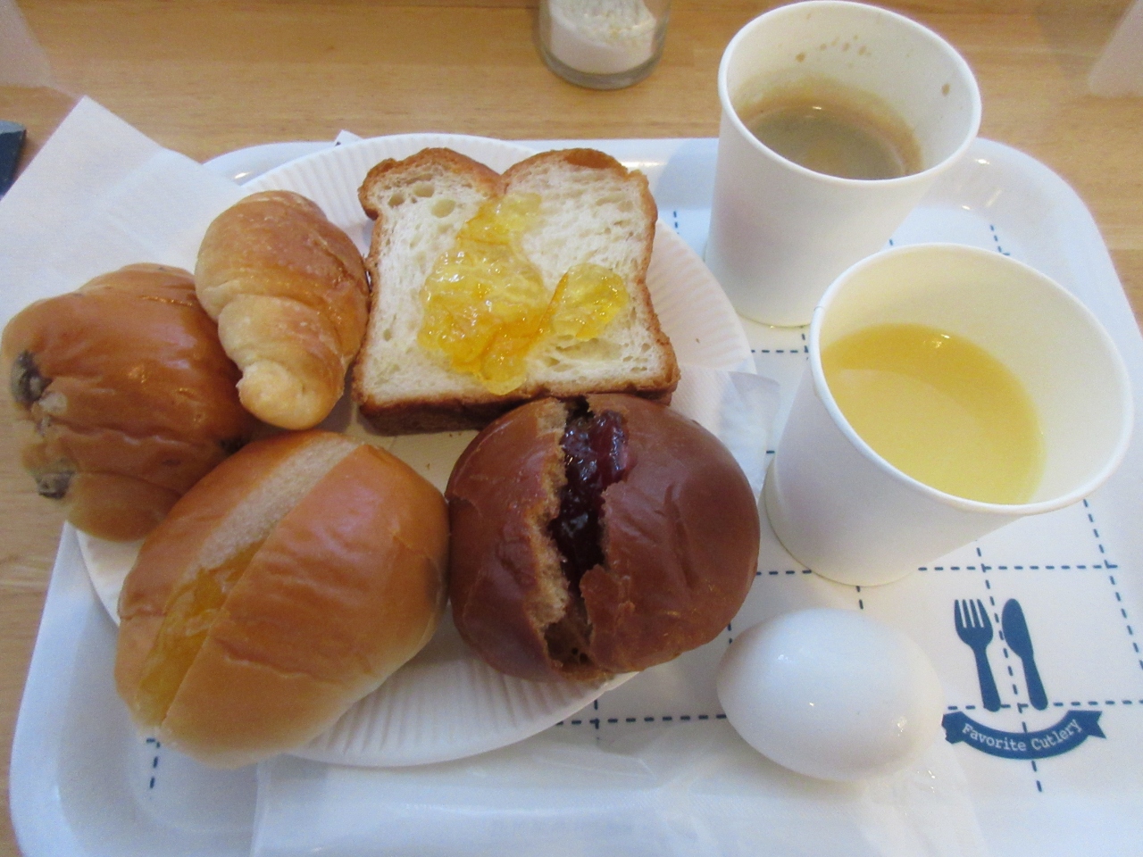 その安さに加えて、パン5種類、ゆで卵、コーヒー、紅茶、緑茶、コーンスープが食べ放題というシンプルな「コンチネンタルブレックファスト」スタイルの朝食が無料で食べられるというのは、とてもありがたいです。