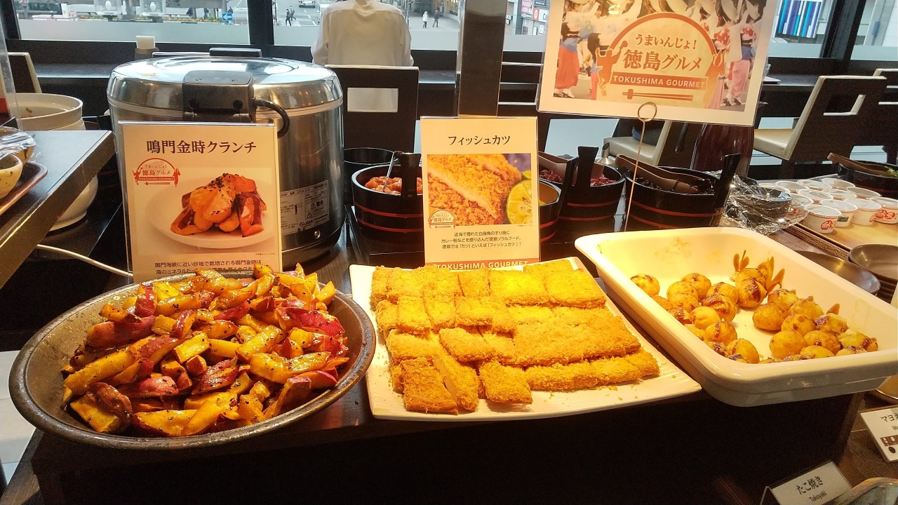 朝食は地のものはフィッシュカツと鳴門金時くらいでしたが、品数はそこそこあり、お味は良かったです。平日だったので、大き目な窓から徳島駅前を眺めながらゆっくり食べられたのが良かったかな。