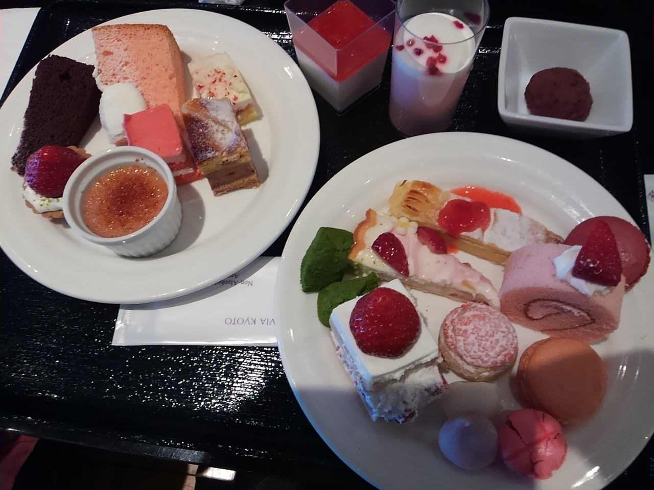 ホテルグランヴィア京都の一階にあるレストランで開催されている「苺づくしのスイーツバイキング6000円」をホームぺージから予約して行ってきました。案内された席に亀岡産のいちご女峰が10個入ったボックスが用意されていてバイキングが開始されるまでドリンクと共に頂くことができました。バイキングコーナーには、3種類のフレッシュ苺が並ぶコーナーをはじめ、苺スフレ、苺のミルフィーユ、苺タルト、苺ロール、苺ムース、苺ショートケーキ、苺クレープなど苺づくし、その他にもアイスクリーム、おはぎ、大福、抹茶わらびもちなどスイーツがたくさん。軽食コーナーには、サラダやピッツァ、ビーフカレー、野菜のミネストローネ、ピラフ、パスタなど食事としても充分な内容。流石に一流ホテルのケーキ類だけあってどれも丁寧に造ってあって美味しかったし、軽食類も遅めのお昼も兼ねてお腹いっぱい頂くことができました。