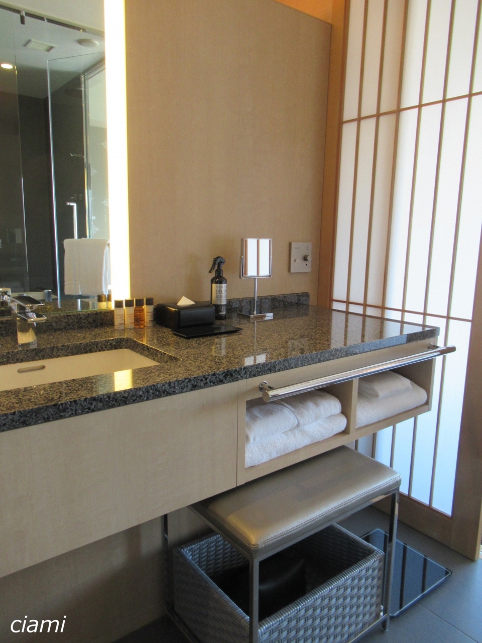 お部屋は、窓のシェードもライトも和の雰囲気で、お部屋とウェットスペースの間も障子です。