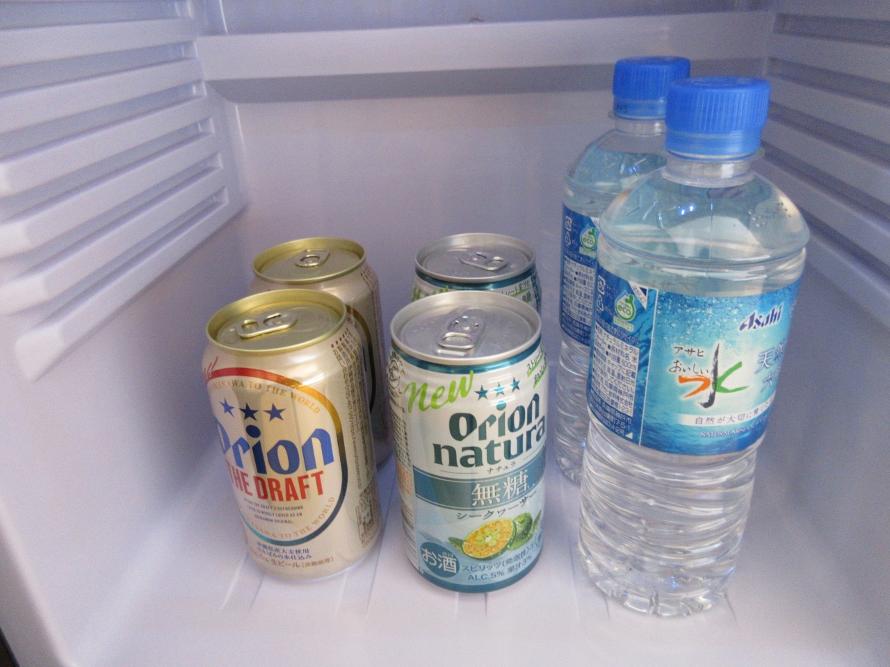 客室の冷蔵庫にはオリオンビールとオリオンビールのメーカーが製造したサワー、さらに関連会社のミネラルウォーターがセットされていました。これらは無量サービスの物でした。また、チェックイン時にホテル1階のバーコーナーで使えるオリオンビール1杯無料券を受け取りました。こちらは、ソフトドリンクに変更も可能です。