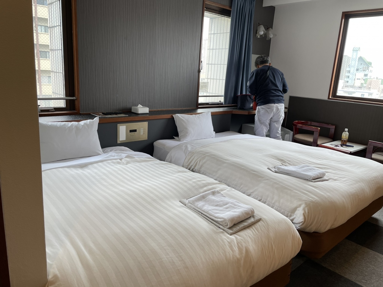 ホテル自体は古めですが清掃も行き届き部屋も広く快適に滞在出来ました。今回はツインに宿泊しましたが、ベッドの頭側の窓の下に使い勝手の良い棚(さん?)があり何気に便利でした。部屋にコンセントは少ないです。氷はフロントで無料でもらえました。