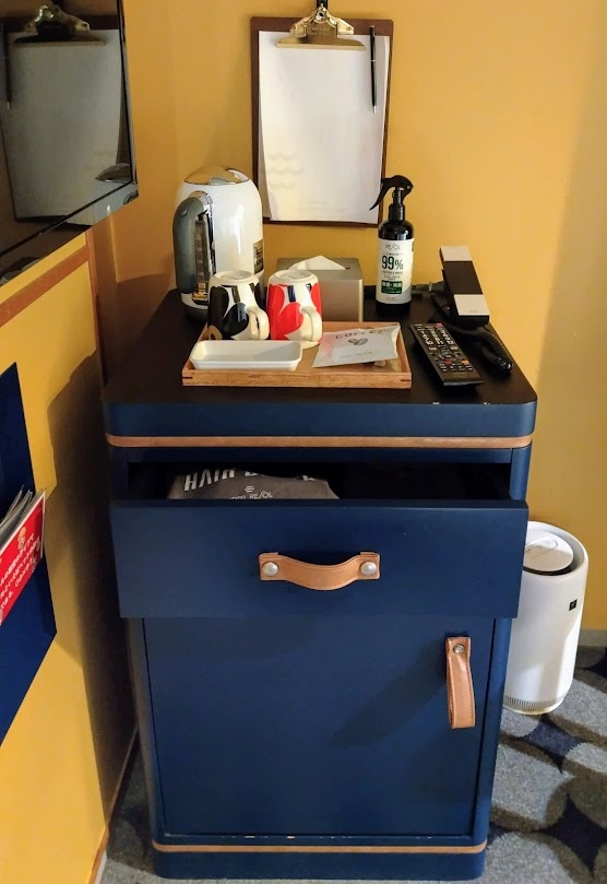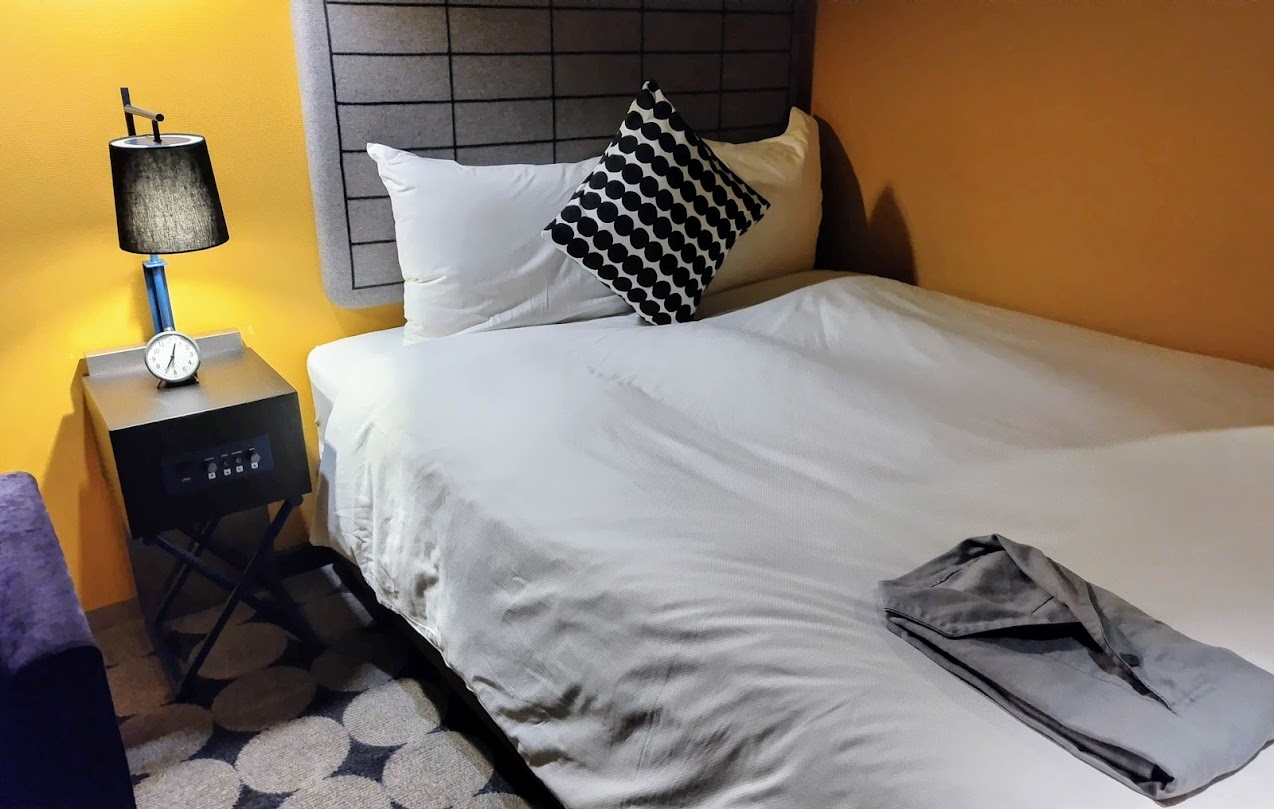 北欧をテーマにしたお洒落なホテルで、部屋にはマリメッコのマグカップやクッション、そしてブルーの布製ボックスの中に冷蔵庫が入っているのもユニークでした。