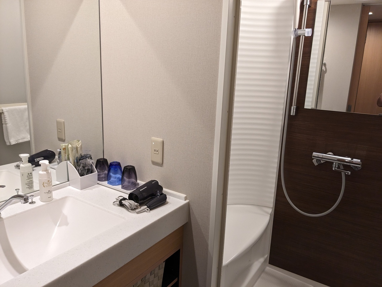 お部屋のシャワーブースには作り付けのイスがあり座りながら洗えて楽チンでした。