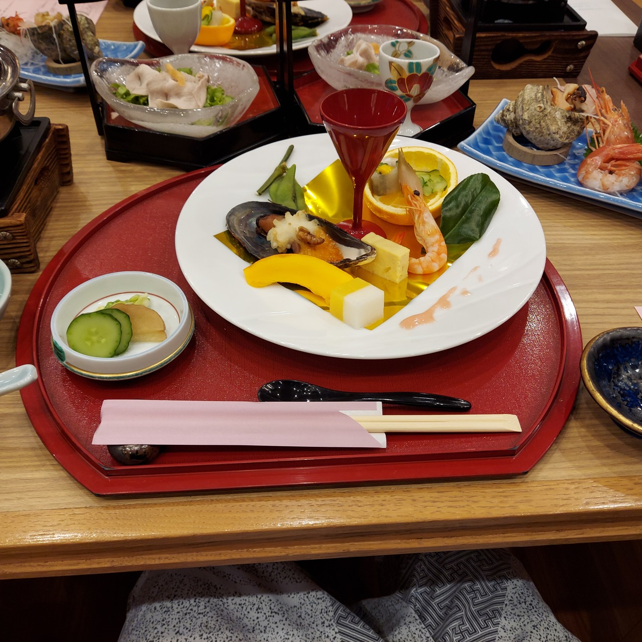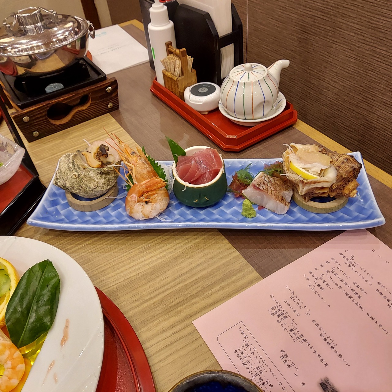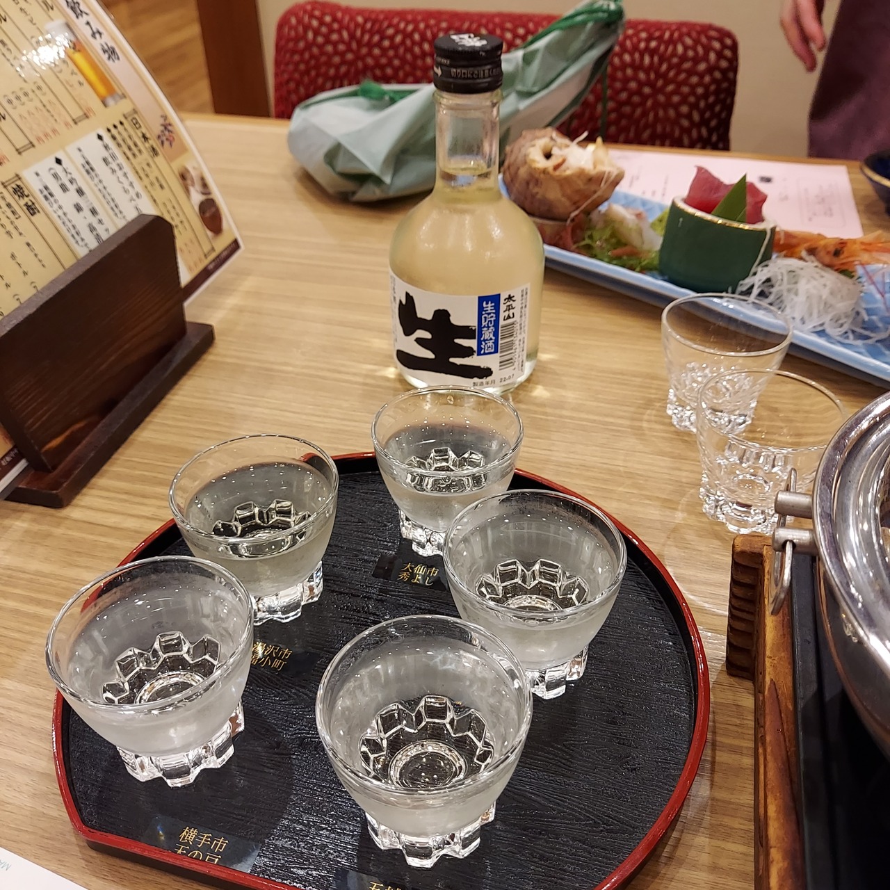 男鹿半島観光のあと宿泊。男鹿近海の魚介と山の幸を使った料理を堪能することができます。料理に合わせて秋田の地酒セットを楽しみました。