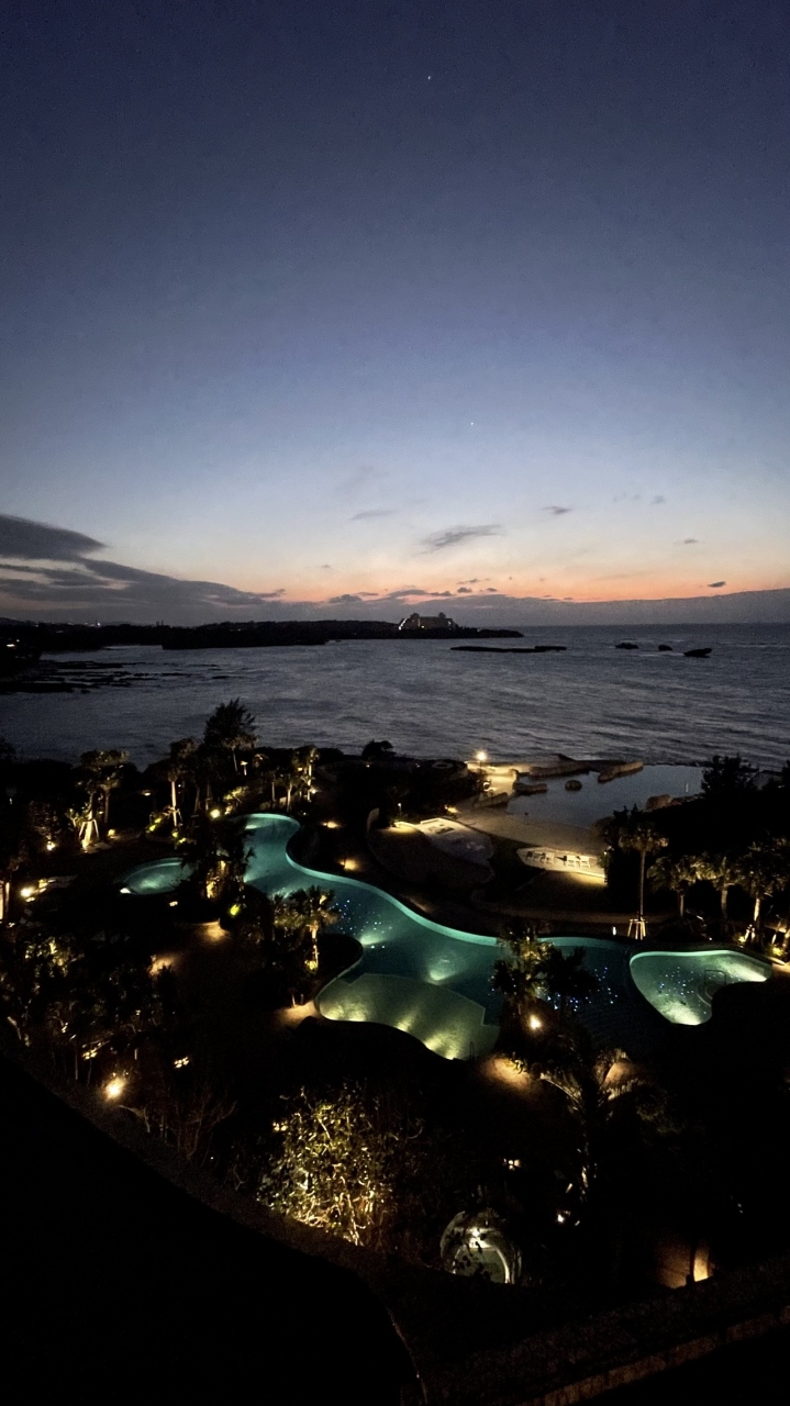 お部屋はオーシャンフロントビューではなくラグーンビューでしたが、夕方は万座毛方面に沈む夕日、夜はバルコニーからライトアップされたプールを見下ろし素敵なチルタイムを過ごせます。