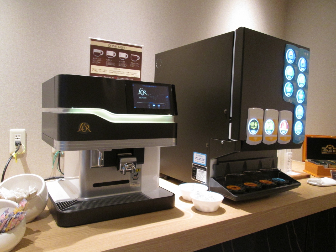 眺望無しと言っても、高い位置に窓があり日差しも入り圧迫感はないです。ロビーの奥にドリンクコーナーがあるので、部屋に持ち帰ることも出来ました。