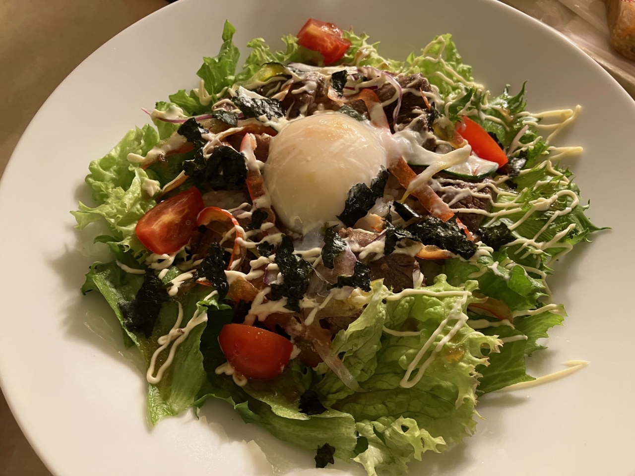 その上に炒めたお肉と生野菜を盛り付け、マヨネーズをかけたものです。)