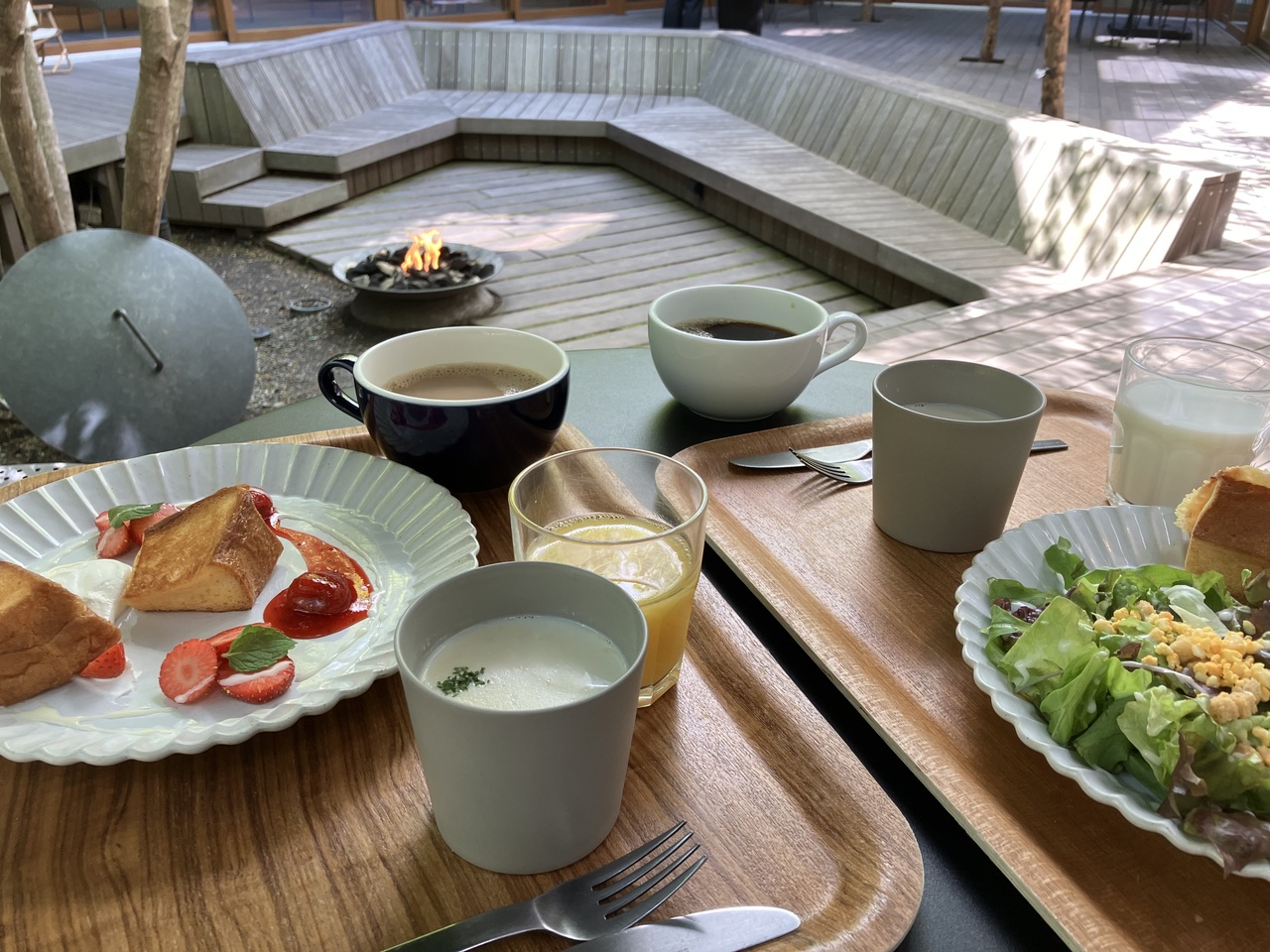 まだ肌寒い時期でしたが、ブランケットもありテラスで食べました。
