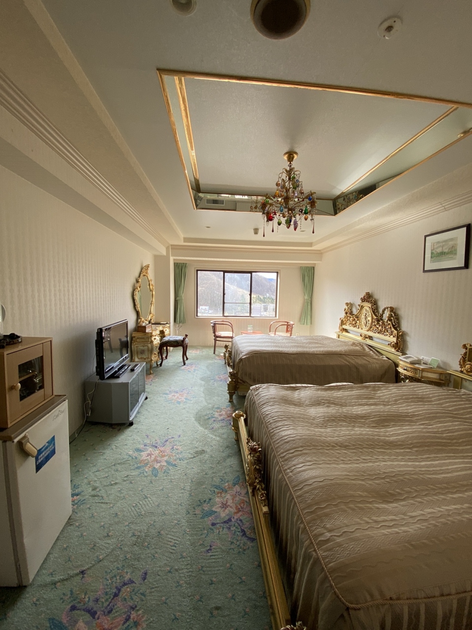 札幌駅14時出発の送迎バスの予約をしてあったので15時頃到着。ホテルロビーは綺麗だが、ツインの部屋はかなり年季がはいっていた。ロイヤル調の雰囲気に圧倒されたが、広々しているのは良かった。空調が全館統一なので、部屋が暑いのに暖房しかなく、窓を開けて調節。