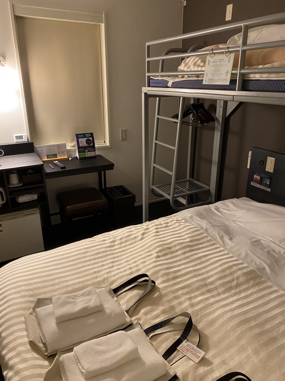 部屋はゲキ狭。人が何とか通れるレベルで、荷物はスーツケースでしたが全く広げられず不便でした。