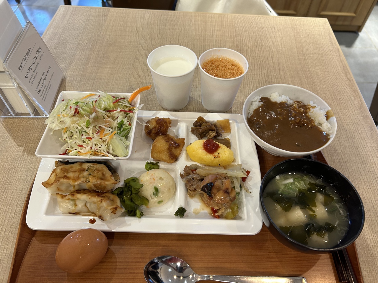 朝食は宇都宮らしく餃子があり、その他はスーパーホテルらしいメニュー。日替わりで一部変わる惣菜があるのもありがたい。また、生卵があるのでTKGやカレーに乗せることができて良い。